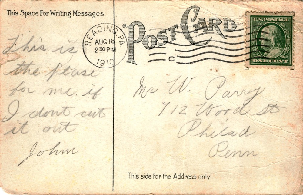 MAKE AN OFFER. THE MORE YOU BUY THE BETTER DEAL I WILL ACCEPT The front of the postcard mentions Berks County Prison in Reading, Pennsylvania, with a handwritten note from someone named John dated August 18, 1919. The back of the postcard has space for writing messages and an address for Mr. W. Parry in Philadelphia, Pennsylvania.