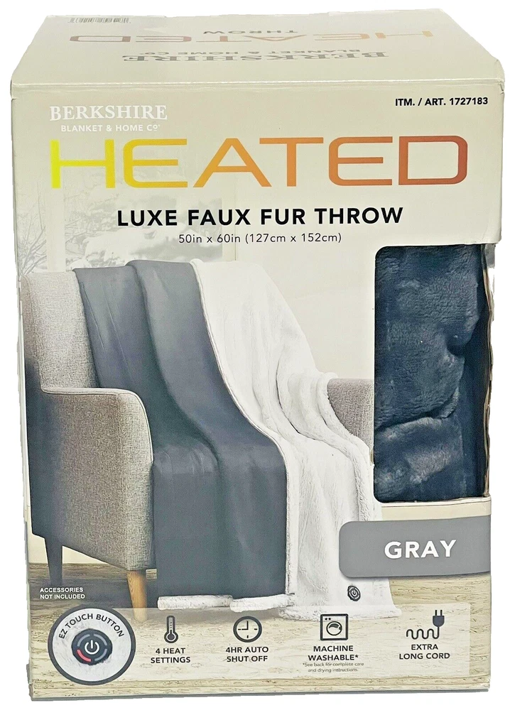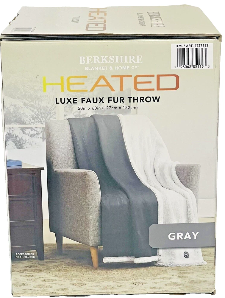 Berkshire Heated Luxe Faux Fur Throw 50" X 60", Gray. Condition is Pre-owned. free shipping NOTE: LISTED AS PRE-OWNED BECAUSE ITS CUSTOMER RETURN FROM COSTCO - (HEATING NOT TESTED) FREE SHIPPING Indulge in luxurious comfort with this Berkshire Heated Luxe Faux Fur Throw. Measuring 50\" x 60\", it's the perfect size for snuggling up in bed or on the couch. The soft and cozy faux fur material is complemented by the heated feature, providing a warm and inviting sensation. The gray color adds a touch of sophistication to any room, making it a great addition to your bedding collection. The blanket is made by Berkshire, a trusted brand in the industry. This blanket is perfect for those who want to add a touch of glam to their home decor.