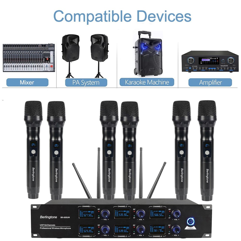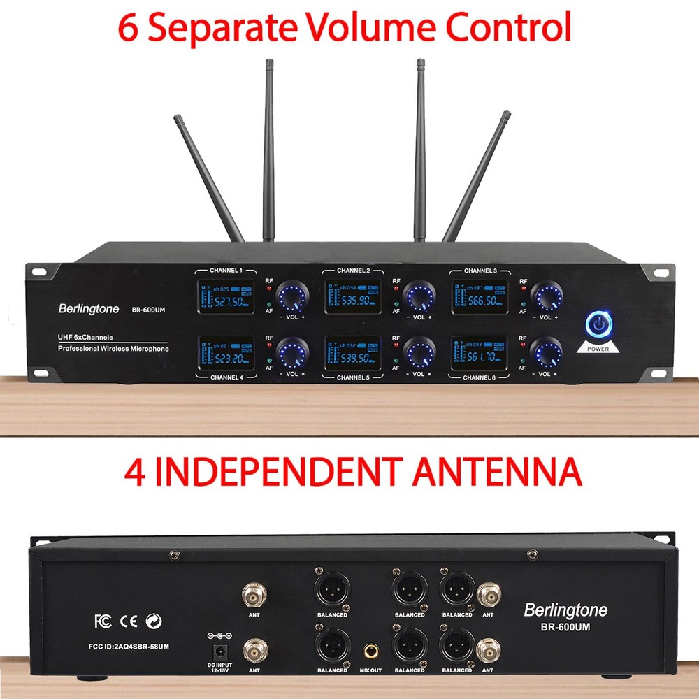 eBay Berligtone BR-600UM Professional Wireless Microphone System, 6-Channel UHF Wireless Mic, Fixed Frequency Metal Cordless Mic with 6 Handheld Dynamic Microphones, 260ft Range, Microphone for Singing, Church, DJ Description All metal construction for 6-channel UHF cordless microphone receiver and high sensitivity unidirectional handheld microphones, suitable for heavy use. High quality dynamic cartridge of each microphone is specially engineered to limit feedback and interference, picking up sound smoothly and transmitting sound hassle-free. Deliver clear, optimal true sound Performance: 6-channel wireless microphone set has fixed frequency design in 527.5MHz, 523.20MHz, 535.90MHz,539.50MHz.566.50MHz and 561.70MHz, providing ultra-signal stability, eliminating unwanted distortion. The professional receiver with four wireless mics has LCD displays showing frequency number, and has individual volume control enabling precise vocal balancing. Up to 260ft long range reliable performance in wide open space line of sight The rack mountable metal receiver features four XLR outputs and one 1/4’’ audio output jack It can auto pair up with transmitters for plug-and-go easy setup. Separate bodypack transmitters are available for a more flexible wireless DJ microphone system. The wireless karaoke microphone set is ideal for all outdoor activities such as party, wedding, speech, conference, small gigs, karaoke Inside the Box: 1x 6-Channel UHF wireless receiver, 4 independent Antenna, 6 x UHF handheld microphone wireless, 1x Power adapter, 1x 1/4’’ Audio cable,1x User’s manual, 6x anti-rolling rings,12x AA batteries for long hour operation Warranty: Berligtone products come with 12-month manufacturer assurance and supportive customer service. Welcome to come to us for troubleshooting or replacement of discontinuous/defective parts Warranty: NEW - 1 Year warranty FEATURES Dual Fix channel Real UHF wireless microphone system Operating range: 196 t0 260 feet (60 t0 80) meters Frequency: 527.5MHz, 523.20MHz, 535.90MHz,539.50MHz.566.50MHz and 561.70MHz 6 handheld wireless dynamic microphone system 4 Rubber antenna Power Switch turn on/off Transmitter Digital screen IR Window Metal case receiver Metal case wireless microphone Balance Audio Output Connection cable Construction of high-quality components of the receiver, handheld microphone Simply connect the audio cable to the receiver and an amplifier or speaker In addition, the volume adjustment knobs on the receiver allow you to adjust the Power adapter: 100 ‐ 240 V, 50 Hz Construction of high-quality components of the receiver, handheld microphone Implemented with dual antennas to maximize the power of the wireless signal and guarantee the stability of the signal the volume adjustment knobs on the receiver allow you to adjust the volumes of the two microphones separately Shipping Alaska and Hawaii $35.00. No International Shipping (Except Canada). Canada $25.00 USPS or UPS, BUYER responsible for all custom fees. No P.O. Box Delivery. No APO/FPO Delivery. PayPal Confirmed Addresses Only. Items Will be Shipped by UPS Ground or USPS on the Same or Next Business day of receiving full payment. UPS/USPS Tracking Number will be provided. Payment PayPal and credit card is Accepted. Immediate Payment is required after the Winning Bid. Item will be shipped immediately on the same or next business day of receiving full payment. California Resident apply sales Taxes. Terms We reserve the right to cancel any bids. Returns accepted only within 30 days of receipt provided item is intact and in original packaging with no signs of impact, sand or water. There will be no refund for tampered items (sticker removed, etc..). Buyer is responsible for shipping charges to us after 30 days. We will send the item back at no charge. All items need to be paid within 5 days of auction closing. Defective items need to go to manufacturer for repair. 30 day return policy applies to all items under manufacturer warranty. All unit are under manufacturer's warranty. Returns All units advertised comes with manufacturer warranty should be referred to the manufacturer in case of repair. There are ABSOLUTELY no exchanges, returns or refunds after 30 days of receipt. Buyer is responsible or shipping charges. We will send the unit back at our cost. Items returned within 30 days of receipt will be exchanged provided there are no impact, water, or mishandling. Please Read Fees CANADIAN BUYERS : Packages will be sent by USPS Standard YOU WILL BE CHARGED CUSTOMS FEES. SELLER IS NOT RESPONSIBLE FOR ANY CUSTOMS CHARGE & Brokerage fees. Delivery We will ship within 1-2 days after receipt of payment, unless the package is Next Day or 2nd Day Air.