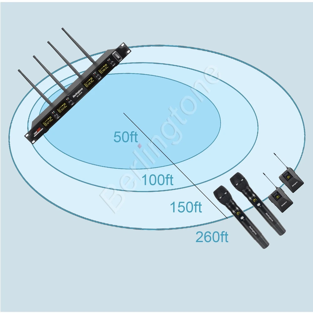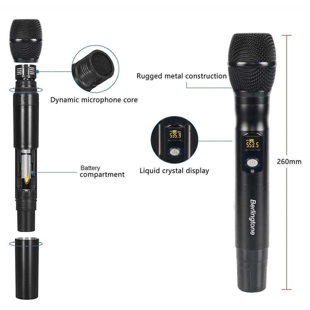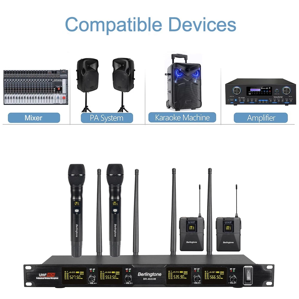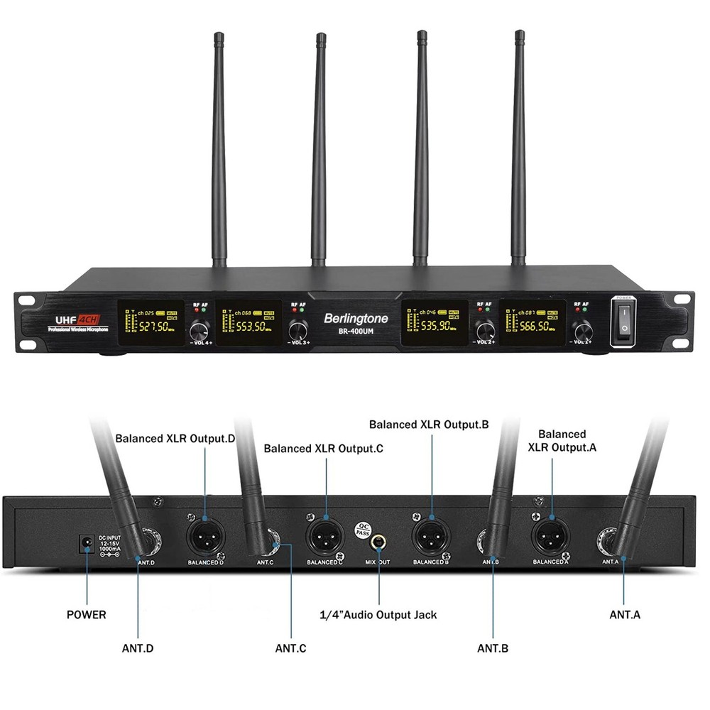 eBay Berligtone BR-402UM Professional Wireless Microphone System, 4-Channel UHF Wireless Mic, Fixed Frequency Metal Cordless Mic with 2+2 Handheld Dynamic Microphones, up to 262ft Range, Microphone for Singing, Church, DJ Description All metal construction for 4-channel UHF cordless microphone receiver and high sensitivity unidirectional handheld microphones, suitable for heavy use. High quality dynamic cartridge of each microphone is specially engineered to limit feedback and interference, picking up sound smoothly and transmitting sound hassle-free. Deliver clear, optimal true sound Performance: 4-channel wireless microphone set has fixed frequency design in 527.5MHz, 535.9MHz, 553.5MHz, and 566.5MHz, providing ultra-signal stability, eliminating unwanted distortion. The professional receiver with four wireless mics has LCD displays showing frequency number, and has individual volume control enabling precise vocal balancing. Up to 262ft long range reliable performance in wide open space line of sight The rack mountable metal receiver features four XLR outputs and one 1/4’’ audio output jack It can auto pair up with transmitters for plug-and-go easy setup. Separate bodypack transmitters are available for a more flexible wireless DJ microphone system. The wireless karaoke microphone set is ideal for all outdoor activities such as party, wedding, speech, conference, small gigs, karaoke Inside The Box: 1x 4-Channel UHF wireless receiver, 4 independent Antenna, 4 x UHF handheld microphone wireless, 1x Power adapter, 1x 1/4’’ Audio cable,1x User’s manual, 4x anti-rolling rings 8x AA batteries for long hour operation Warranty: Berligtone products come with 12-month manufacturer assurance and supportive customer service. Welcome to come to us for troubleshooting or replacement of discontinuous/defective parts Warranty: NEW - 1 Year warranty FEATURES Real UHF wireless microphone system Dual Fix channel Operating range: 196 t0 260 feet (60 t0 80) meters Frequency: in 527.5MHz, 535.9MHz, 553.5MHz, and 566.5MHz 4 handheld wireless dynamic microphone system Rubber antenna Power Switch turn on/off Transmitter Digital screen IR Window Metal case receiver Metal case wireless microphone Balance Audio Output Connection cable Construction of high-quality components of the receiver, handheld microphone Simply connect the audio cable to the receiver and an amplifier or speaker In addition, the volume adjustment knobs on the receiver allow you to adjust the Power adapter: 100 ‐ 240 V, 50 Hz Construction of high-quality components of the receiver, handheld microphone Implemented with dual antennas to maximize the power of the wireless signal and guarantee the stability of the signal the volume adjustment knobs on the receiver allow you to adjust the volumes of the two microphones separately Shipping Alaska and Hawaii $35.00. No International Shipping (Except Canada). Canada $25.00 USPS or UPS, BUYER responsible for all custom fees. No P.O. Box Delivery. No APO/FPO Delivery. PayPal Confirmed Addresses Only. Items Will be Shipped by UPS Ground or USPS on the Same or Next Business day of receiving full payment. UPS/USPS Tracking Number will be provided. Payment PayPal and credit card is Accepted. Immediate Payment is required after the Winning Bid. Item will be shipped immediately on the same or next business day of receiving full payment. California Resident apply sales Taxes. Terms We reserve the right to cancel any bids. Returns accepted only within 30 days of receipt provided item is intact and in original packaging with no signs of impact, sand or water. There will be no refund for tampered items (sticker removed, etc..). Buyer is responsible for shipping charges to us after 30 days. We will send the item back at no charge. All items need to be paid within 5 days of auction closing. Defective items need to go to manufacturer for repair. 30 day return policy applies to all items under manufacturer warranty. All unit are under manufacturer's warranty. Returns All units advertised comes with manufacturer warranty should be referred to the manufacturer in case of repair. There are ABSOLUTELY no exchanges, returns or refunds after 30 days of receipt. Buyer is responsible or shipping charges. We will send the unit back at our cost. Items returned within 30 days of receipt will be exchanged provided there are no impact, water, or mishandling. Please Read Fees CANADIAN BUYERS : Packages will be sent by USPS Standard YOU WILL BE CHARGED CUSTOMS FEES. SELLER IS NOT RESPONSIBLE FOR ANY CUSTOMS CHARGE & Brokerage fees. Delivery We will ship within 1-2 days after receipt of payment, unless the package is Next Day or 2nd Day Air.