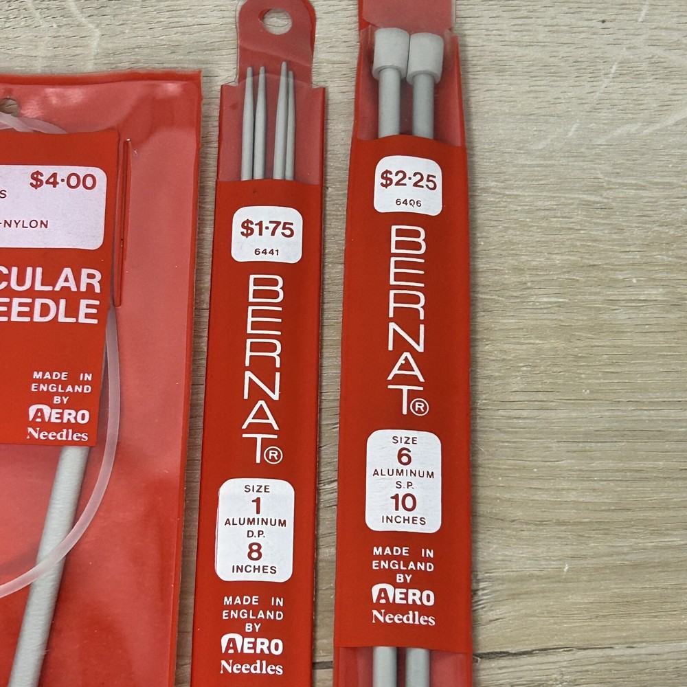 Lot of 4 Bernat aluminum nylon knitting needles. Various lengths and sizes. 2 circular, 1 single pointed and 1 double pointed.
