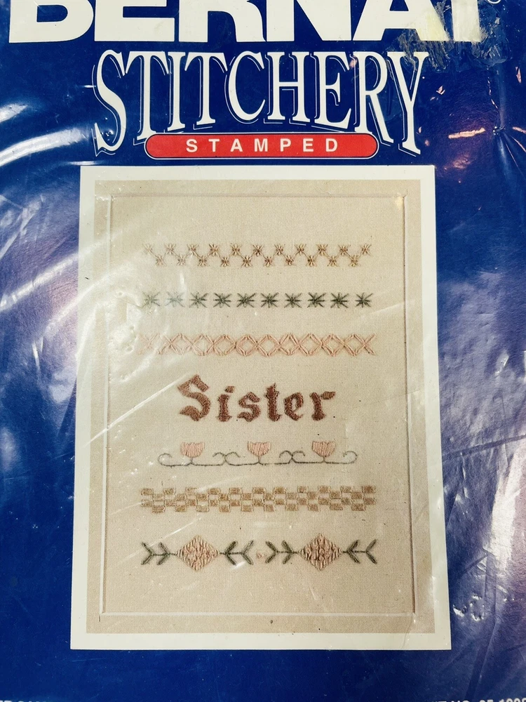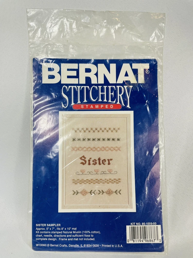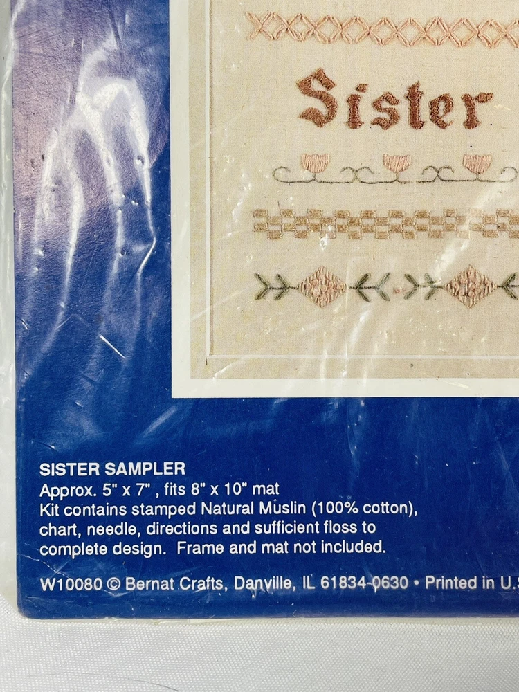 Bernat Stitchery Stamped Sister Sampler Approx 5" x 7" fits 8" x 10" Mat Vintage. NOS- New in package. Package show signs of wear from storage and price tag. Please see pictures for all details.