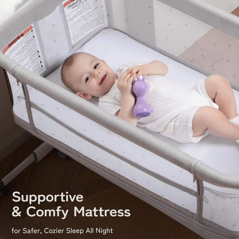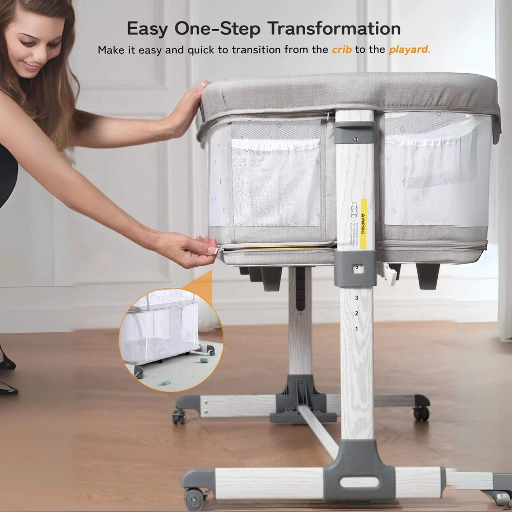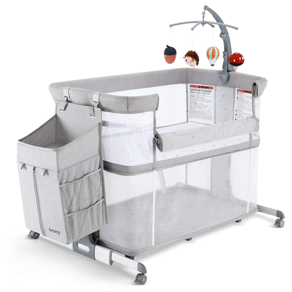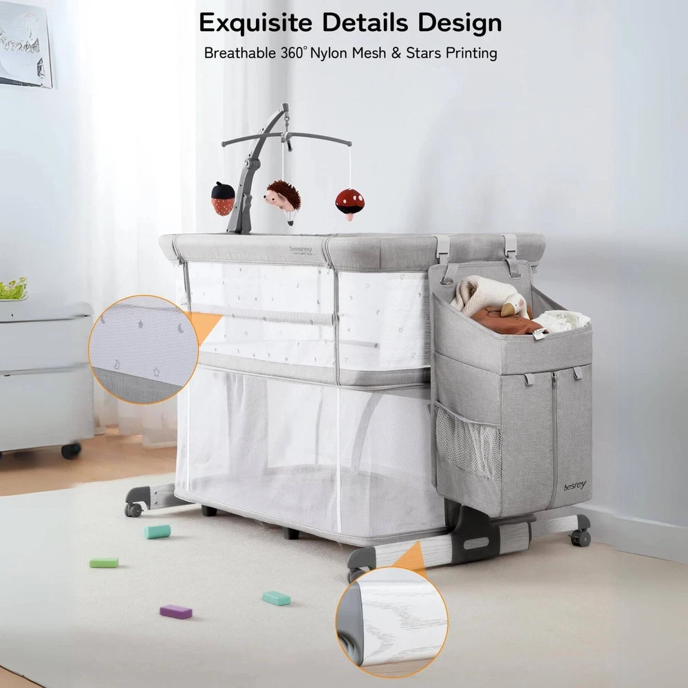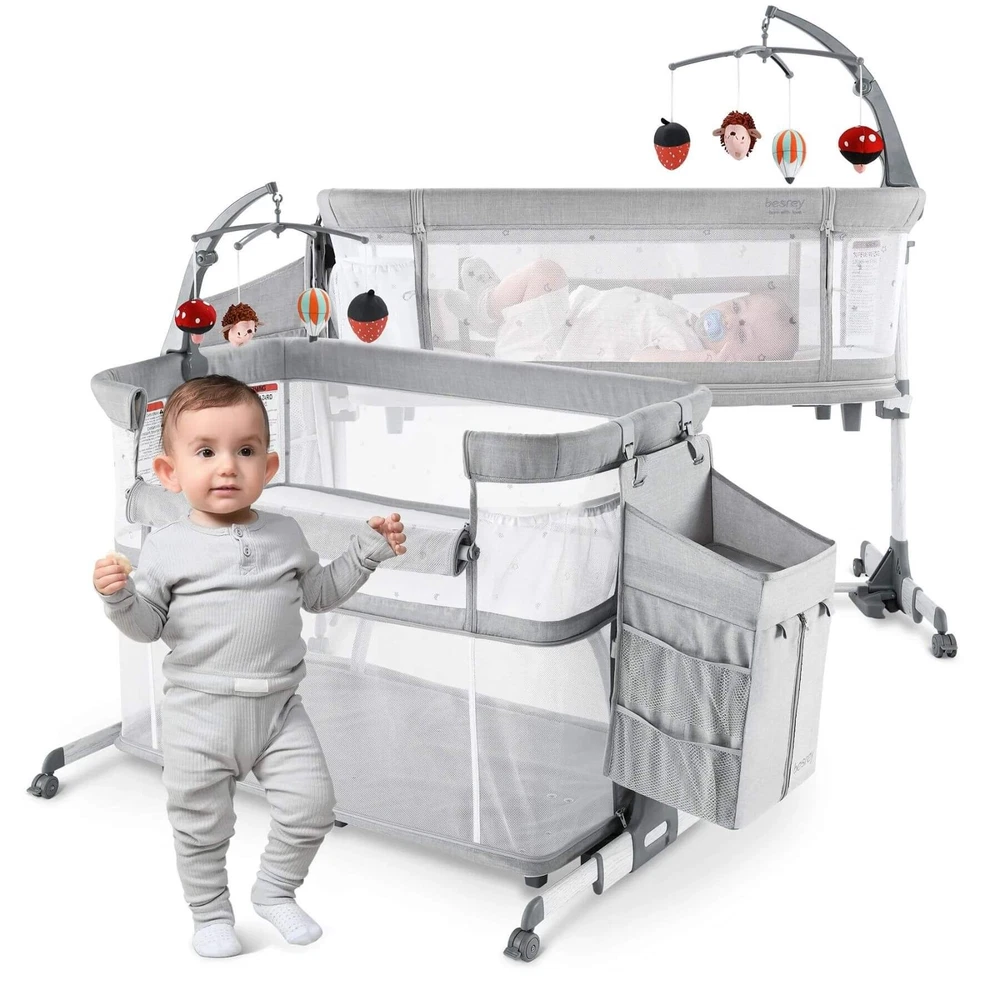 Besrey 5-in-1 Baby Bassinet Bedside Sleeper with Playpen, Mobile Toy Hanger, Hanging Diaper Bag, and Mattress DESCRIPTIONS The Besrey 5-in-1 Baby Bassinet Bedside Sleeper is the ultimate solution that grows with your baby. The crib seamlessly trasitions from a cozy bassinet to a fun playard. From peaceful sleeping environments to engaging playtime, this crib has it all, accompanying your baby from birth to over 1 year old. FEATURES 5 IN 1 Baby Bassinet: Standalone Bassinet (0-6M), Bedside Crib (0-6M), Baby Cradle (0-6M), Portable Crib (6-12M), and even Portable Playard (12-18M) in one Easy Transition: Very easy and quick to transition from the bassinets to the playard/mini crib, suitable up to 18 months 360° Breathable Mesh: Breathable mesh on the top and sides promotes breathability and visibility, allowing your baby to breathe better 5 Adjustable Heights: Adjustable to heights between 29.13" and 33.46" measured from floor to top of bassinet, it’s suitable for varying bed heights 360° Swivel Wheels with Brakes: This bedside sleeper for baby is seated on 4 universal casters each with its own sturdy brake Foldable Mobile Toy Hanger: designed with a mobile toy hanger, providing a source of entertainment for infants and supporting their developmental growth Hanging Diaper Bag: Come with a spacious hanging diaper bag with 4 pockets, 1 large compartment, and 1 shelf, perfect for your baby's essentials Spine Protective Mattress: A spacious shape memory mattress made of skin-friendly 3D vertical cotton is specifically designed for infants (0-6 months) Removable Zippered Mosquito Net: Provides extra protection from mosquito bites both outdoors and indoors Tool-free Assembly: Quick and easy assembly with no tools needed in 1 Min, solving your baby's sleep problems in unfamiliar surroundings or outside home Safety Ensured: The besrey bassinets bedside sleeper is fully compliant with ASTM, CPSIA, and CCPSA standards, keeping your baby safe SPECIFICATIONS Product Dimensions: 37.4"L x 27.6"W x 33.5"H Product Weight: 28 lbs Color: Elegant Grey Materials: Metal, Fabric Includes: Bassinet, Mattress, Mosquito Net, Detachable Sheet, Travel Bag, Storage Basket Manufacture SKU# BRBD003102AMXX Assembly Required: Yes Warranty: 2-year limited manufacture warranty Weight Capacity: 50 lbs Product Care: Hand Wash Only. ABOUT BESREY Besrey, established in 1998, are dedicated to providing parents with thoughtfully designed products built to the highest standards. Our mission is to ensure your baby's safe and healthy growth while easing the stress of being a new parent. We rigorously test our products and use only the best materials to meet the strictest safety criteria. Founded by product engineer and mom, Mirabelle, Besrey was created to address the flaws in existing baby products. Today, Besrey offers a wide range of safe, reliable, and comfortable baby products in over 130 countries, helping parents worldwide solve their parenting challenges with love and care. Besrey 5-in-1 Baby Bassinet Bedside Sleeper with Playpen, Mobile Toy Hanger, Hanging Diaper Bag, and Mattress DESCRIPTIONS The Besrey 5-in-1 Baby Bassinet Bedside Sleeper is the ultimate solution that grows with your baby. The crib seamlessly trasitions from a cozy bassinet to a fun playard. From peaceful sleeping environments to engaging playtime, this crib has it all, accompanying your baby from birth to over 1 year old. FEATURES 5 IN 1 Baby Bassinet: Standalone Bassinet (0-6M), Bedside Crib (0-6M), Baby Cradle (0-6M), Portable Crib (6-12M), and even Portable Playard (12-18M) in one Easy Transition : Very easy and quick to transition from the bassinets to the playard/mini crib, suitable up to 18 months 360° Breathable Mesh : Breathable mesh on the top and sides promotes breathability and visibility, allowing your baby to breathe better 5 Adjustable Heights: Adjustable to heights between 29.13" and 33.46" measured from floor to top of bassinet, it’s suitable for varying bed heights 360° Swivel Wheels with Brakes: This bedside sleeper for baby is seated on 4 universal casters each with its own sturdy brake Foldable Mobile Toy Hanger: designed with a mobile toy hanger, providing a source of entertainment for infants and supporting their developmental growth Hanging Diaper Bag: Come with a spacious hanging diaper bag with 4 pockets, 1 large compartment, and 1 shelf, perfect for your baby's essentials Spine Protective Mattress: A spacious shape memory mattress made of skin-friendly 3D vertical cotton is specifically designed for infants (0-6 months) Removable Zippered Mosquito Net : Provides extra protection from mosquito bites both outdoors and indoors Tool-free Assembly: Quick and easy assembly with no tools needed in 1 Min, solving your baby's sleep problems in unfamiliar surroundings or outside home Safety Ensured: The besrey bassinets bedside sleeper is fully compliant with ASTM, CPSIA, and CCPSA standards, keeping your baby safe SPECIFICATIONS Product Dimensions: 37.4"L x 27.6"W x 33.5"H Product Weight: 28 lbs Color: Elegant Grey Materials: Metal, Fabric Includes: Bassinet, Mattress, Mosquito Net, Detachable Sheet, Travel Bag, Storage Basket Manufacture SKU# BRBD003102AMXX Assembly Required: Yes Warranty: 2-year limited manufacture warranty Weight Capacity: 50 lbs Product Care: Hand Wash Only. ABOUT BESREY Besrey, established in 1998, are dedicated to providing parents with thoughtfully designed products built to the highest standards. Our mission is to ensure your baby's safe and healthy growth while easing the stress of being a new parent. We rigorously test our products and use only the best materials to meet the strictest safety criteria. Founded by product engineer and mom, Mirabelle, Besrey was created to address the flaws in existing baby products. Today, Besrey offers a wide range of safe, reliable, and comfortable baby products in over 130 countries, helping parents worldwide solve their parenting challenges with love and care. × × 