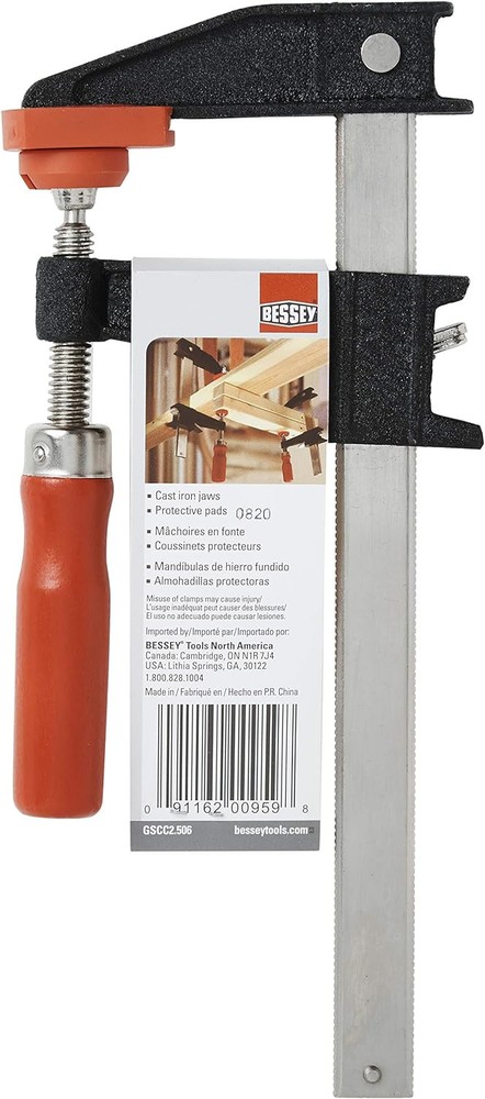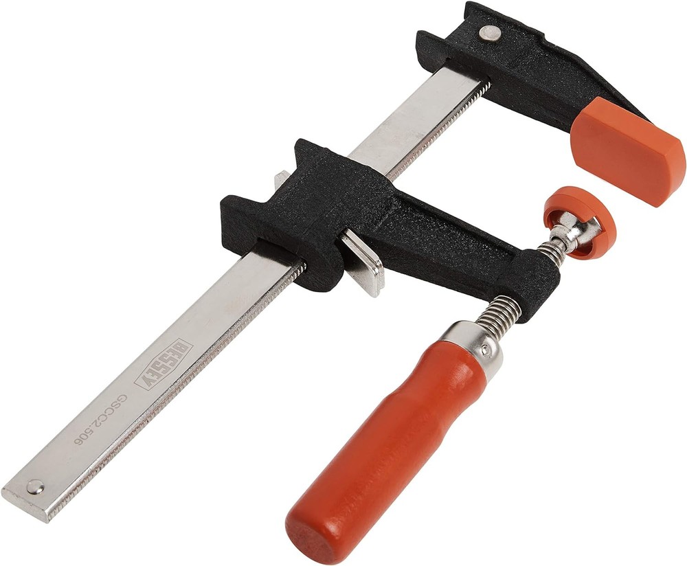 Bessey Clutch Style Bar Clamps - 6 In 600 lb - GSCC2.506 - 0, Black Product Details Material: Cast Iron Brand: Bessey Item dimensions L x W x H: 9.88 x 4.5 x 1.18 inches Color: Black Style: Modern Item Weight: 1.27 Pounds Tensile Strength: 600 Pounds Manufacturer: Bessey Part Number: GSCC2.506 Item Weight: 1.27 pounds Product Dimensions: 9.88 x 4.5 x 1.18 inches Country of Origin: China Item model number: GSCC2.506 Is Discontinued By Manufacturer: No Size: 0 Item Package Quantity: 1 Number Of Pieces: 1 Measurement System: Metric Included Components: Bessey - GSCC2.506 Batteries Included?: No Batteries Required?: No Material: Cast Iron Brand: Bessey Item dimensions L x W x H: 9.88 x 4.5 x 1.18 inches Color: Black Style: Modern Item Weight: 1.27 Pounds Tensile Strength: 600 Pounds Manufacturer: Bessey Ergonomic Handle - Our Bessey GSCC2 clutch style bar clamp is designed with an ergonomic handle, providing you with a comfortable grip while working on your woodworking projects. This feature ensures less hand fatigue and a more enjoyable experience while using our clamps. Versatile Clutch Style Clamps - The clutch style clamps included in this set are perfect for a variety of light to medium duty work projects. Whether you're working on woodworking , or home improvement tasks, these clamps will provide the necessary support and stability you need. Durable Construction - Our bar clamps for woodworking are made with powder coated cast-iron fixed and sliding jaws, ensuring durability and long-lasting use. The nickel plated serrated rail, used with the clutch system, provides added strength and prevents the clamp from slipping during use. Non-Marring Protection Pads - The standard non-marring protection pads on our Bessey clutch style bar clamps help protect your work surfaces from scratches and damage. Versatile - The clutch style bar clamp is suitable for a wide range of applications. Its versatility makes it an essential addition to your woodworking workbench and tool collection. Product Description The BESSEY clutch style clamps are a popular regular duty clamp that can be used for a wide range of projects. These economical clamps are available in a wide range of sizes starting with the GSCC2.506 with a 2-1/5 " throat x 6 " capacity up to the GSCC5.024 with a 5" throat x 24" capacity & a range of clamping pressures from 600 to 1200 Lbs. The are powder coated, ductile cast iron jaws. Selected models available with 2K cushion grip handle. BESSEY. Simply better From the Manufacturer New economical Bessey F-Style clutch bar clamps come with cast heads with powder-coated finish to resist corrosion and chipping. Bessey provides a zinc finished rail with a two piece clutch plate system for opening and closing the lower movable jaw. The Bessey clutch clamps are also provided with protective pads on both the top and bottom jaws and come with a comfortable wooden handle.