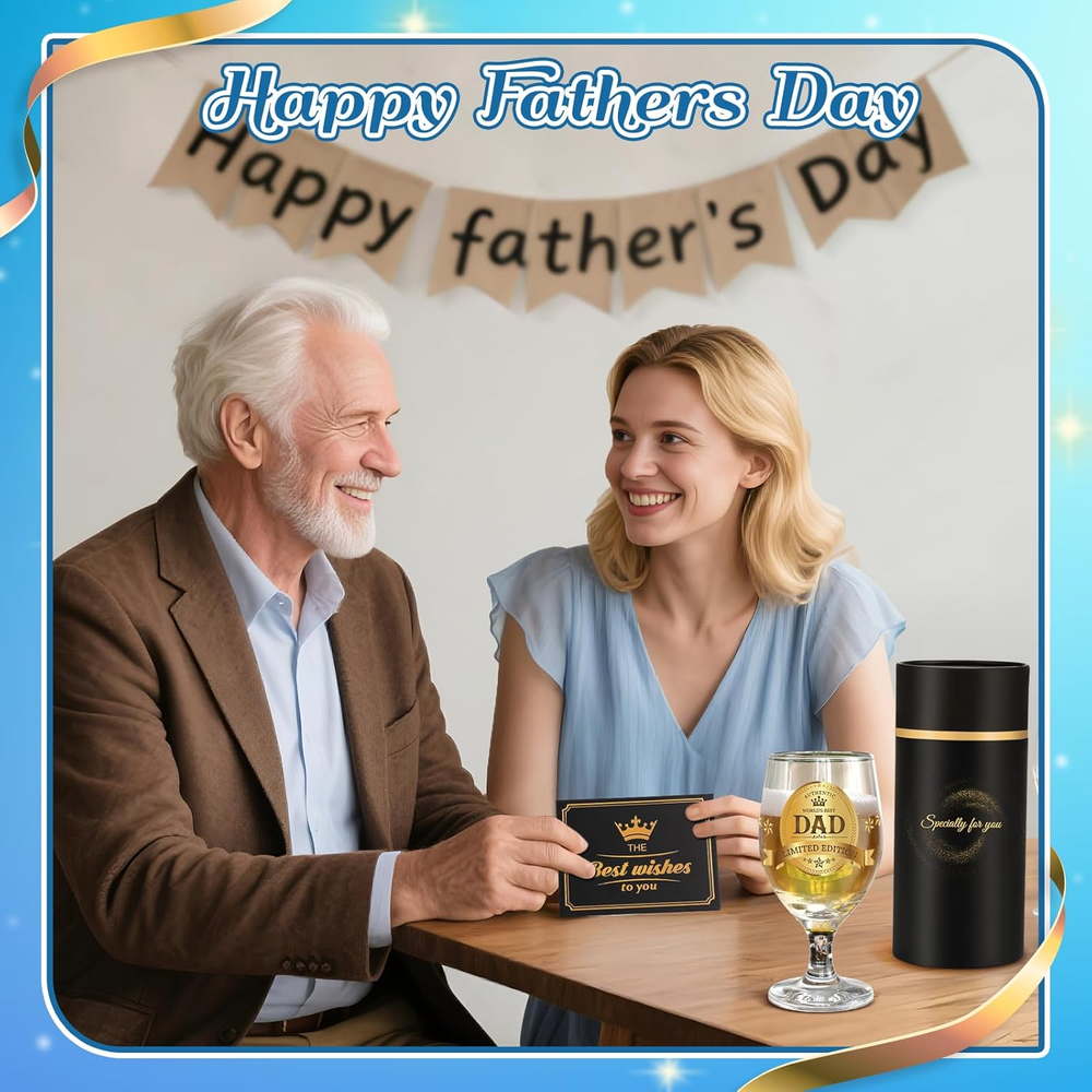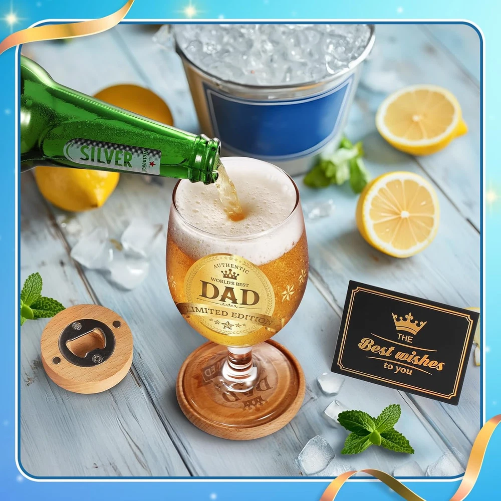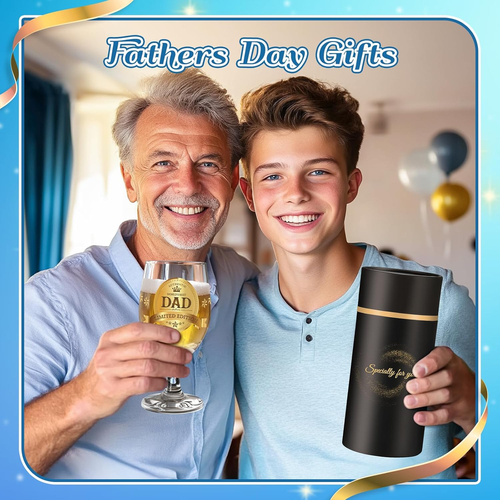 Father's Day Gift for Dad: Surprise your dad this Fathers Day with our beer glasses. Elegantly engraved with "AUTHENTIC WORLD'S BEST DAD LIMITED EDITION" and decorated with "Special For You" on the gift box, the glass will make him proud to sip his favorite drink! Glittering gold accents on beer glass add jolly holiday decorations to his bar. Birthday Gifts for Dad: Make his birthday truly memorable with fun and practical gifts. Perfect for serving up IPAs, stouts, craft beers, and wines, this beer glass allows dad to enjoy his drinks with friends while creating unforgettable memories on his special day. Christmas Stocking Stuffers Basket Gifts: Show your appreciation on Father's Day with unforgettable gift basket. Each beer glass comes with a beautiful gift box, bottle opener, coaster, and a heartfelt card that expresses your warm wishes, this gift basket will be a surprise he will always treasure. Premium Beer Glasses:Crafted from premium glass, our beer glass boasts sturdy edges and a robust base for maximum durability. The vibrant, fade-resistant print and foam-padded gift box ensure your gift arrives in flawless condition. For longevity, we recommend hand washing – avoid dishwashers to preserve the stunning design. Gifts for Dad :Celebrate your dad's uniqueness with this beer glass,designed for optimal temperature retention. With a generous capacity of 14 oz and a manageable diameter of 4.13 in, it’s convenient to handle and easy to clean. Ideal as stocking stuffers for dad, father, stepdad, father in law,to be dad, new dad,daddy and so on. Product Description