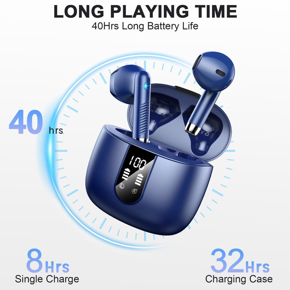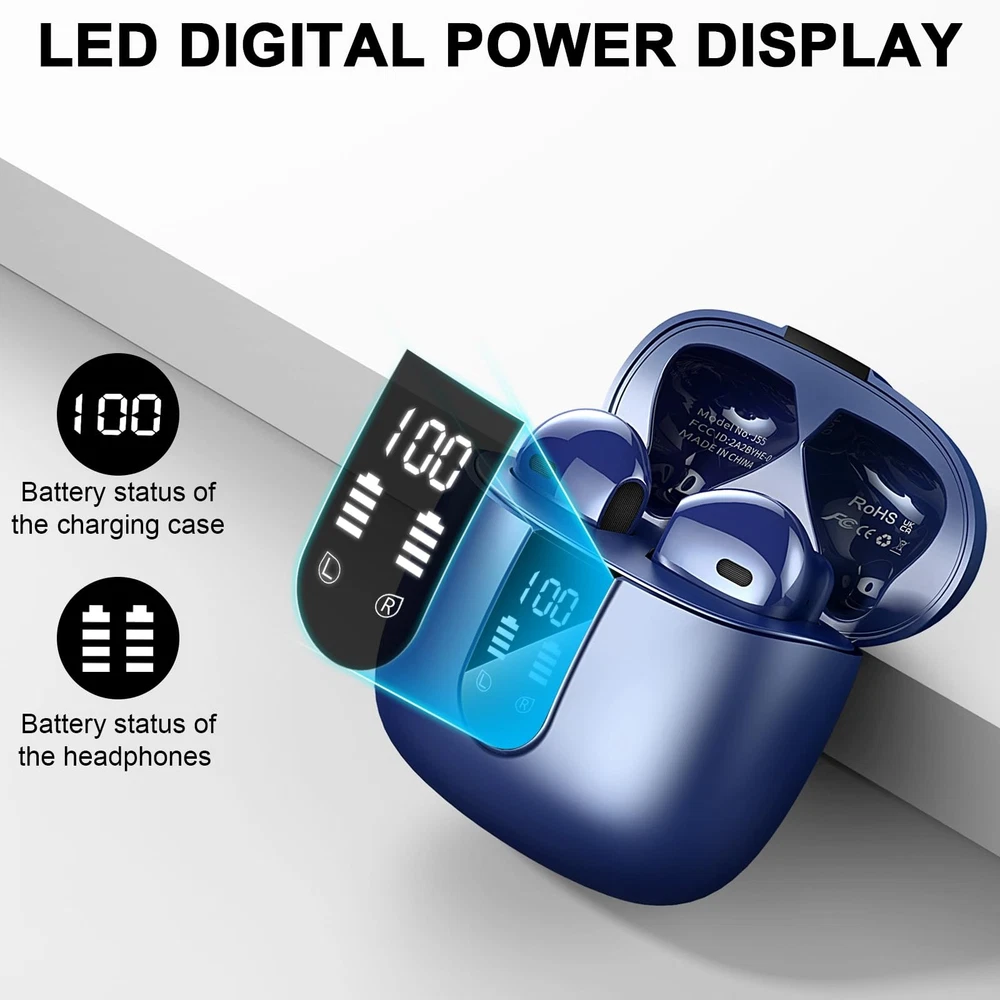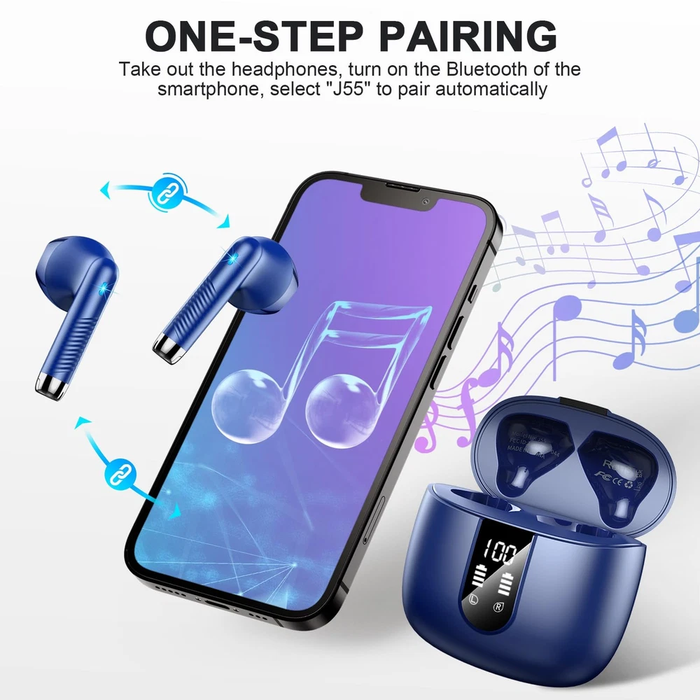 Wireless Earbud, Bluetooth 5.3 Headphones with Microphone Bluetooth 5.3 Chip and Auto Pairing: True wireless earbud adopt Bluetooth 5.3 chip, support HSP, HFP, A2DP and AVRCP Bluetooth communication protocols. Ultra Low-Latency is more than 3 times faster than a conventional wireless earphones, offers stable and enough distance 32 ft connection for you. Pick up 2 wireless earphones from the case, they will be paired with each other automatically. Then click on "J55" from the device list to connect the cordless headphones with your device. Immersive Stereo Soundstage and Clear Call: Adapting powerful 16Ω Input impedance and Ф6mm moving coil speakers, bluetooth earbuds with microphone provide a powerful and wide sound range, which makes the treble full of dynamics, and the bass powerful. The microphone of wireless headphones is made of monocrystalline silicon, which makes the microphone highly sensitive to sound from different angles, perfect for capturing vocals, enabling clear phone or video calls. 40Hrs Playtime and Dual LED Digital Display: 8 Hours of smallest earbud listening time per charge is enough for most long runs. A combination of USB-C quick-charge and the 4 full charges provided by the charging case gives you an excellent experience of long endurance. (8H in the earbud and 32H in the charging case). The running earbud pocket-size storage charging case, features with dual LED digital power display. When charging for the case, the LED light will start to flash from 1 to 100. Lightweight Ergonomic Design and IP7 Waterproof: Weighing just 3g, workout headphones ear buds feel virtually weightless as they fit comfortably and securely in your ears. They are ergonomically designed to ensure a secure fit while guaranteeing fatigue-free ears and long-lasting comfort. The waterproof earbud is nano-coated and reaches IP7 waterproof. Waterproof headphones will make an ideal companion while taking the dog for a walk, outwork, gym, cycling, or taking a jog. Easy To Use and Wide Compatibility: In ear headphones features with capacitive touch interface and a full control suite, the intuitive operation make earbud for android reasonably simple to use. Just simple tap to play/pause, volume control, track forward/reverse, call answer/end and digital-assistant activation. Android headphones wireless is paired easily with both iOS, Android devices, and most devices with Bluetooth(such as Windows laptop/tablet/desktop PC via Bluetooth).