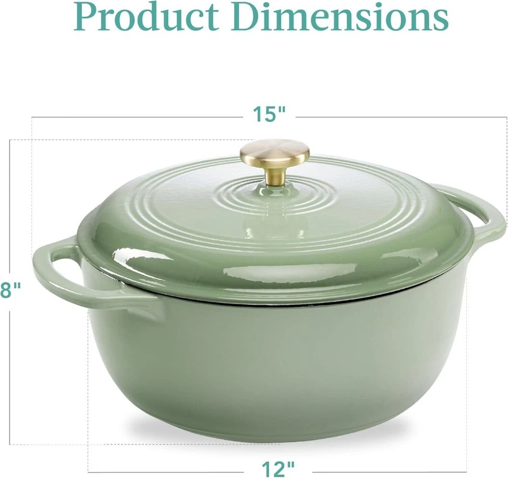 Package: 1X Best Choice Products 7.5 Quart Enamel Cast-Iron Round Dutch Oven, Family Style Heavy-Duty Pre-Seasoned Cookware for Home, Kitchen, Dining Room, Oven Safe w/Lid, Dual Handles - Sage Green Description: HEAVY-DUTY DESIGN: Thick cast iron is set with a glossy exterior finish and an enamel interior to combine lasting quality with easy upkeep. OVEN & STOVETOP READY: Sturdy and versatile, this dutch oven is well-suited to any cooking system! Use the side handles to take your meal from gas and electric ranges to your oven and grill; perfect for roasting, frying, or baking your favorite dishes FAMILY-SIZED: Feed large groups at potlucks, parties, and other gatherings as this family-sized dutch oven holds up to 7.5 quarts of casserole, soup, stew, roasts, and your other signature meals! HIGH HEAT RETENTION: Built to reach and maintain temperatures up to 480 degrees Fahrenheit, a set of condensation bumps on the heavy lid helps seal in moisture, heat, and flavor ELEVATE YOUR KITCHEN: A clean, glossy finish makes this dutch oven both a nostalgic icon and a modern addition to any well-equipped kitchen; features a brushed metal handle (silver or gold) for an extra touch of style!; OVERALL DIMENSIONS: 15"(L) x 12"(W) x 8"(H); OVEN CAPACITY: 7.5 Qt.