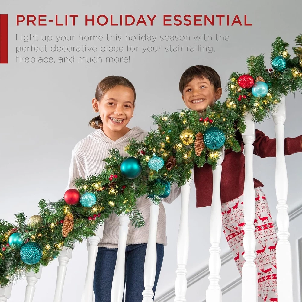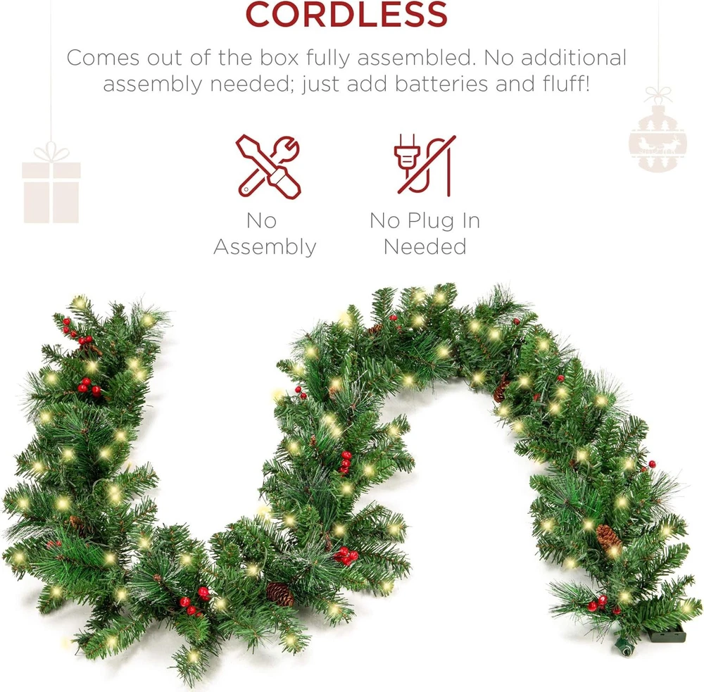 FULL APPEARANCE: Fully fluffed spruce-style branches use hundreds of tips to lend a healthy, natural appearance to your holiday display PRE-LIT HOLIDAY ESSENTIAL: Decorate your stair railing, fireplace, and more with a realistic, 9-foot garland strip that's pre-strung with 50 lights to brighten up the season HIGH-QUALITY DESIGN: Crafted with durable, flame-retardant PVC branches and a hidden battery box, so you can light it up in a variety of decorative setups without loose cords hanging CORDLESS DESIGN: This garland comes with a weather-resistant battery box, making it ideal for both indoor and outdoor use-no plugs needed, simply add it to your favorite display and watch it shine! PRE-DECORATED: Trimmed with pine cones and artificial red berries to create lively, yet wintery appeal that captures the holiday spirit; OVERALL DIMENSIONS: 108"(L) x 8"(W) x 6"(H)