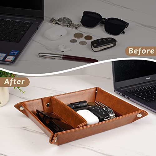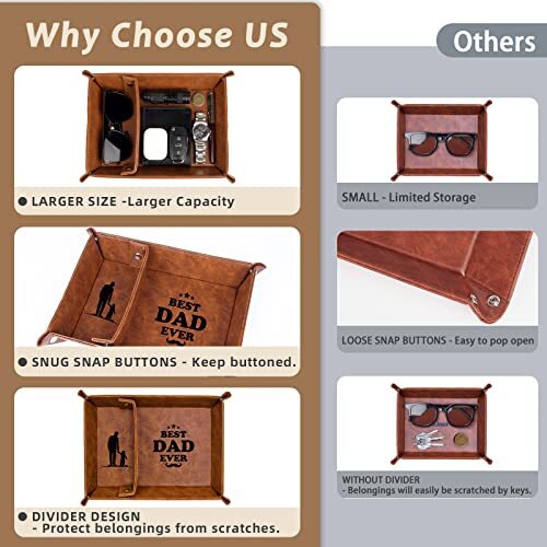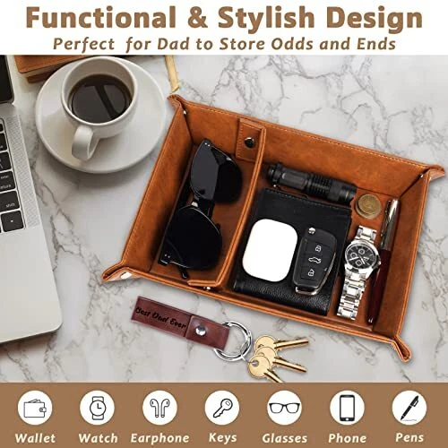 Mainul Extension Gifts for Dad Fathers Day, Best Dad Ever PU Leather Valet Tray and Keychain, Unique Dad Birthday Gifts from Daughter Son Kids, New Dad Gifts for Men Father Husband from Wife BEST GIFTS FOR DAD- Looking for a sweet gift for dad? This meaningful leather valet tray for men will be cool gifts for dad who wants nothing. Measuring 11.61*8.66*1.88 inches (L*W*H) , it's the ideal size on a drawer, desk nightstand, dresser, entryway shelf storage, w dad can easily drop his things when he comes home every day. BEST DAD EVER GIFTS - Engraved with BEST DAD EVER texts and artwork captured the spirit of fatherhood, making this a heartfelt and sentimental reminder of your love that dad will cherish forever. Especially if you struggle with words or don't live close to your dad, our mens nightstand tray dad birthday gift will help bridge the gap and let your dad know that he's always on your mind. USEFUL DAD GIFTS FOR MEN - Make your dad's life easier with this multipurpose tray. As a decorative tray, it is also a functional leather tray organizer gift for dad who have everything. It helps to store his important daily essentials such as keys, wallet, glasses, coins, watches and more, whether in the living room, bedroom or office. Your dad will love having this mens catchall tray by his side. THOUGHTFUL DESIGN - Crafted with resistant PU leather materials and premium snaps, high-quality valet tray organizer for men is great in keeping tray shape and resistant enough for a long lasting. Dual compartments design enables dad to efficiently to store items avoid cluttering and keep glasses scratch-free. UNIQUE DAD GIFTS CHOICE- This leather tray is perfect and unique for dad gift from daughter son kids wife, birthday gifts for dad, new dad gifts for husband from wife, presents for dad, Fathers Day, Thanksgiving gifts, Xmas stocking stuffers and more. INSTALLATION TIPS - The provided instructions streamline the assembly process. First, flex the tray by bending it upwards and downwards once or twice help you to easily snap buttons on the corners. Please ensure that the divider's shorter end is at the bottom, then snap the buttons to firmly attach it. Free Shipping We offer FREE shipping on all orders! We ship within 5 business days, usually sooner. We use shipping services like: ePacket, USPS, China Registered Air Mail Post for faster shipping: UPS, FedEx, DHL (at extra cost) Please contact us for more details about shipping services that we provide. Return You can return a product for up to 30 or 60 days (Mentioned in the product listing) from the date you purchased it. Any product you return must be in the same condition you received it and in the original packaging. Please keep the receipt. Payment We only accept payment from eBay managed payments. Please pay as soon as possible after winning an auction, as that will allow us to post your item to you sooner! PS: We only ship orders after the payment complete. Customer satisfaction is very important to us. If you have any problem with your order, please contact us and we will do our best to make you satisfied. Please visit our eBay store to check out other items for sale! Thank you for your visite to our store.