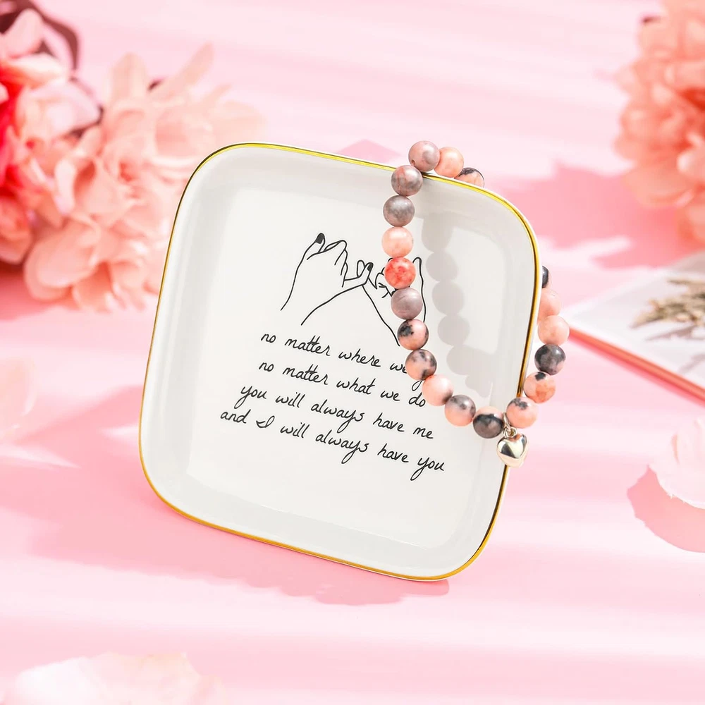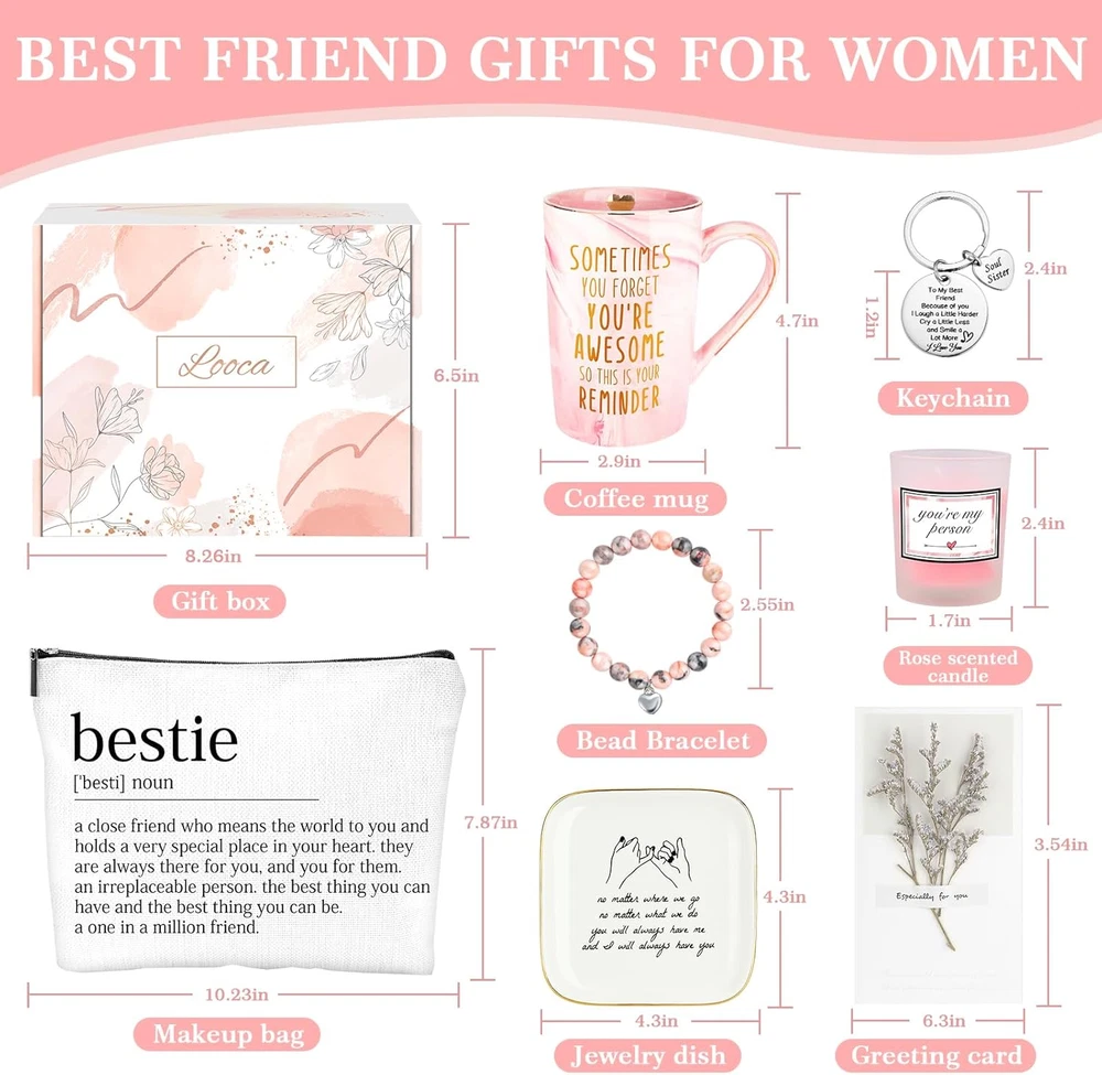 Gifts for Best Friend Woman: Bestie deserves to have a heartfelt and inspiring set of gifts that express your love and sincerity. The gift box you've prepared for your best friend will become one of the most unforgettable memories of her life, making her feel cherished, cared for, and respected. It will warm her heart and let her know she's truly special. Best Friend Gifts for Women Unique: This high-quality gift set comprises 8 carefully selected and thoughtfully designed items, making it the unique gift with a best friend theme. The bestie gifts include 1* 14-ounce coffee mug, 1* makeup bag, 1* natural rose-scented candle, 1* exquisite dried flower card, 1* pink and beautiful pearl bracelet, 1* ceramic jewelry tray, 1* keychain, and 1* gift packaging box. Meaningful Bestfriend Gift Ideas: Each items on this gift box features various meaningful quotes, expressing your friend's significance to you. Ideal for best friend christmas gift, birthday gifts for best friend, bestfriend christmas gift, friendship gifts for women friends unique, bestie birthday gifts for women, fun gifts for coworkers. Reliable Quality and Premium Products: The makeup bag is made of high-quality linen cotton fabric, durable, and fashionable. The patterns on the coffee cup are all unique, symbolizing the special friendship between you two. The keychain is made of 316L stainless steel, never rusting, staining, or fading. The beaded bracelet uses natural gemstones, not easily damaged, suitable for most wrists. The jewelry tray is made of high-quality glazed ceramic, with a smooth surface and a stylish golden fram Best Friend Gift Box Are Ready: All neatly packaged in a high-quality, beautiful gift basket box, eliminating the awkwardness of cheap gift boxes filled with tacky dollar store items. No need for re-packaging. The ideal last-minute gift! Product Description Present your best friend with an unforgettable and unique, exquisite 8-piece gift set! Package contains: 1*14OZ Coffee Mug 1*Naturl ross scented candle 1*Bestie makeup bag 1*Pink beautiful bead bracelet 1*Ceramic jewelry dish 1*Best sister keychain 1*Exquistie dried flower greeting card 1*Gift packing box Best Friends Ring Dish This ring dish features a meaningful quote, perfect for expressing your sister's significance to you. The jewelry tray is designed with a stylish touch and makes a perfect gift for your best friend, reminding your soul sister of your unique bond. Wearing natural gemstones can attract wisdom, strength, and truth. As you wear it, the petite heart-shaped pendant will serve as a reminder that no matter where we go, no matter what we do, I will always be by your side, and I will love you forever. High-Quality Inspirational Mug This inspiring coffee cup is crafted from high-quality ceramic material . The mug is imprinted with the message: 'Sometimes you forget you're great, so this is your reminder.' It will constantly motivate and encourage you best friend to face challenges and setbacks with bravery. Bestie Makeup Bag Below the 'Bestie,' the explanatory section emphasizes the importance and value of the best friend. Soul Sisters Keychain Crafted from high-quality stainless steel, this keychain is a special message to your best friend:Life can be tough, but with you, my smiles multiply. Rose Candle Made from 100% natural soy wax and premium rose essential oil, this candle's fragrance is long-lasting, immersing your friend in the world of roses. REVISED ON 11/11/2024