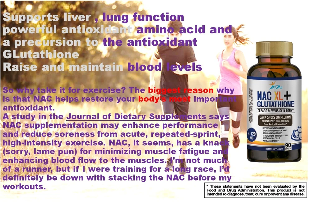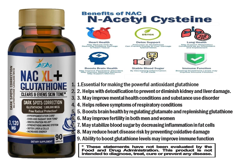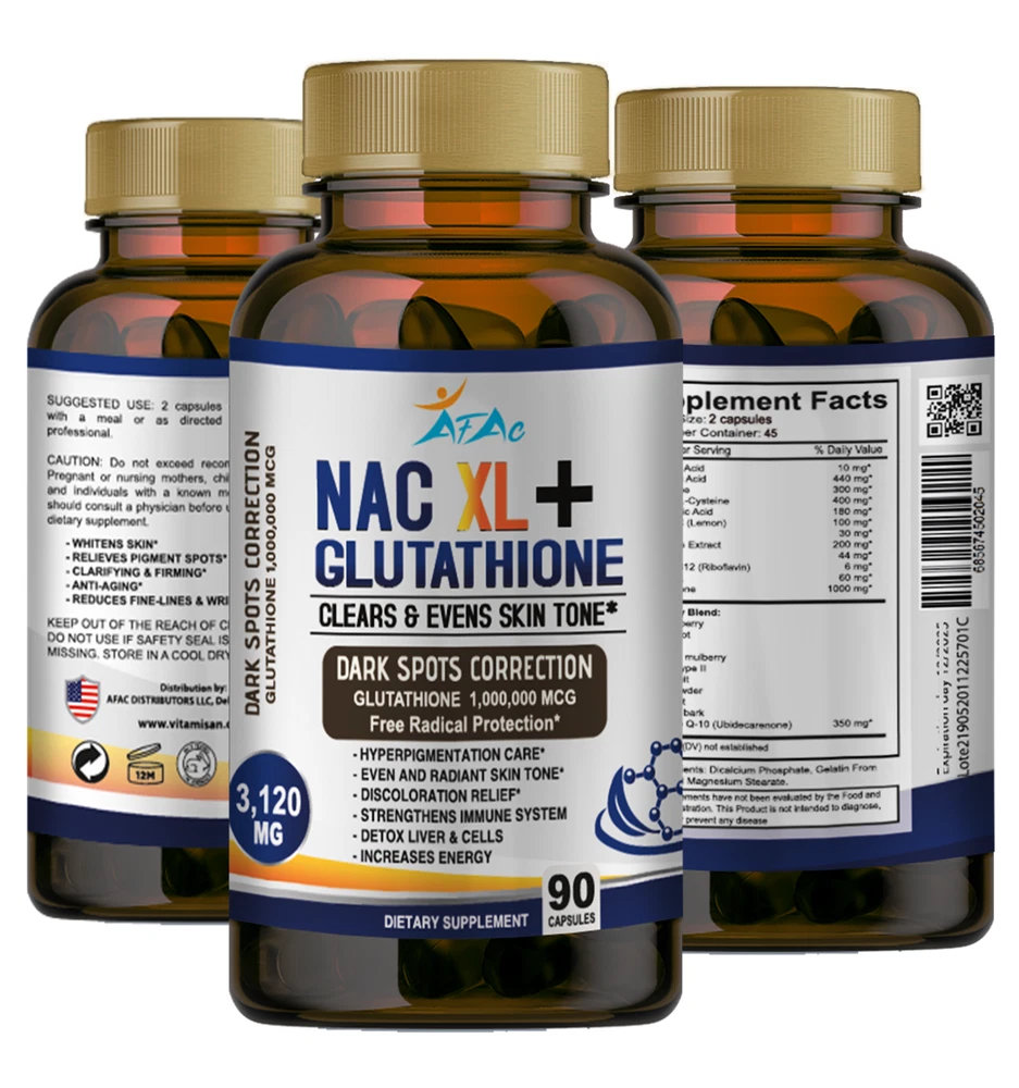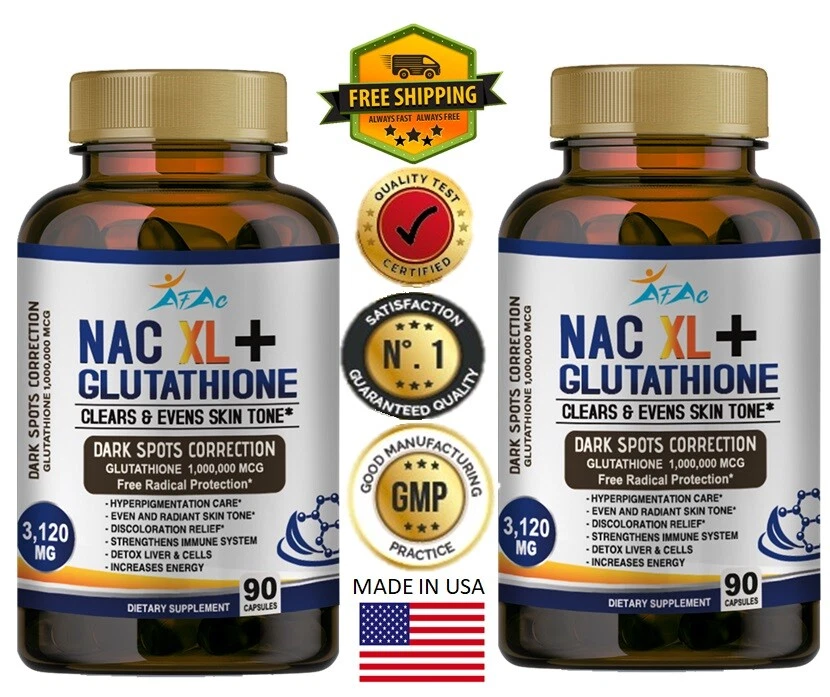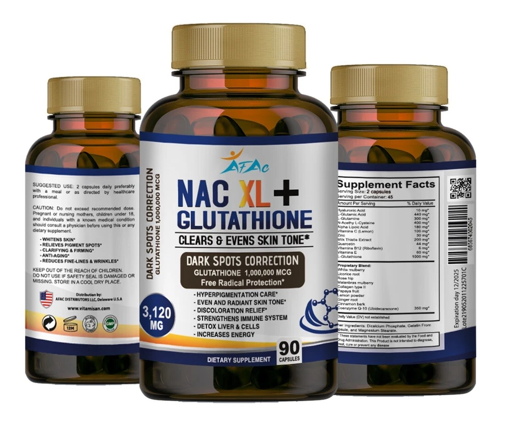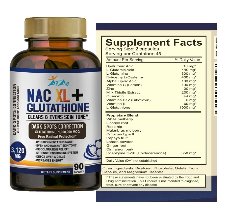 Brand: NAC XL AFAC Features: All Natural, Animal Cruelty-Free, Gluten-Free, Non-GMO Item Weight: 6oz Department: Men, Unisex, Women Size: 180 When to Take: After Meal, After Workout, Before Meal, Before Workout, During Workout Active Ingredients: L GLUTAMIC, VITAM E, Acetyl-L-Carnitine, Glutamine, Glutathione, Hyaluronic Acid, L-Glutathione, Quercetin, Vitamin B12, Zinc Expiration Date: 12/2026 Main Purpose: dark spot, in, Anti-Aging, Liver Health Purpose: Boost Glutathione, Immune, & Liver Health Type: All-in-One Product Country/Region of Manufacture: United States Flavor: Neutral WARNING*******: BUYER IS RESPONSIBLE OF DELIVERY IF ADDRESS IS A COURIER AGENCY NOTE2: TO BE USED FOR MINIMUM USE OF 90 DAYS CONSTANTLY Number of Pills: 180 Formulation: Capsule NOTE3: NATURAL PRODUCT / THIS IS NOT TO CURE/TREAT/ PREVENT ANY DISEASE NOTE: UPGRADE TO PRIORITY SHIPPING FOR ONLY $ 5 Ingredients: Coenzyme Q10 / Ubiquinone, L-Glutathione, N-Acetyl L-Cysteine, Vitamin C (Ascorbic Acid)