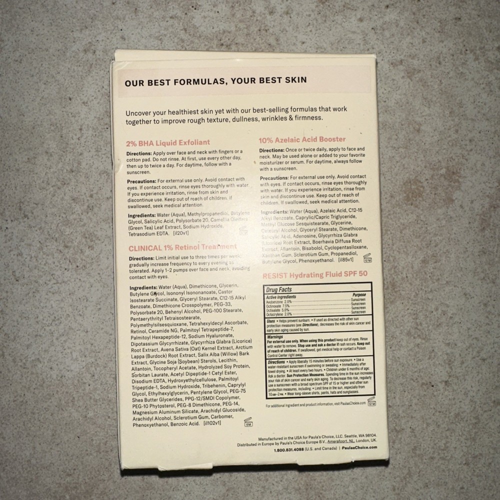 Best Of Paula’s Choice Kit 2% BHA Liquid Exfoliant, 10 % Azaleas Acid, Hydration. 4pc Kit 1. 2% BHA liquid exfoliate 1. You extended daily hydration fluid SPF 50. 1. 10 % Azelaic acid booster 1. 1% retinal treatment w/vit c Thank you Bin X