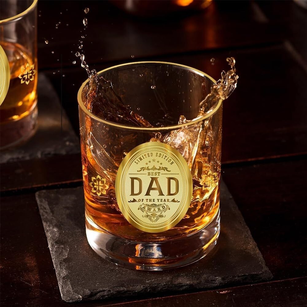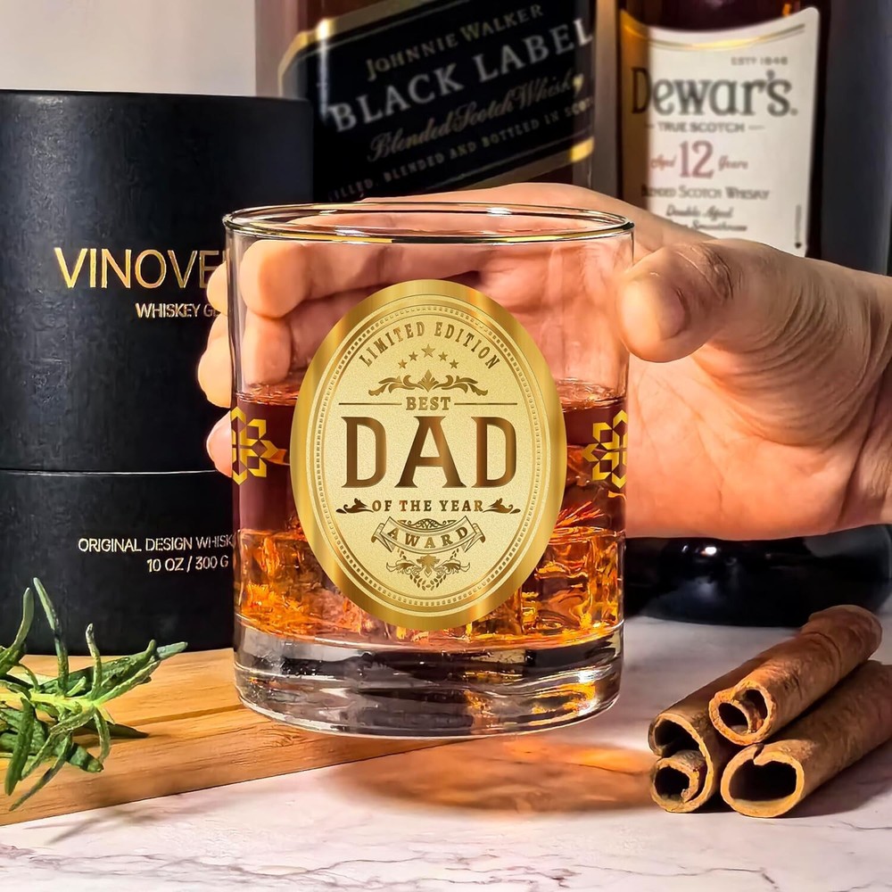 Best Dad of the Year Whiskey Glasses, Personalized Whiskey Gifts for Dad, Father Description : UNIQUE DAD GIFT FOR MEN: For new dads, to-be dads, or current fathers, this ‘Best Dad of the Year’ whiskey glass is the ultimate gift for Father’s Day, birthdays, Thanksgiving, Christmas, New Year and more. It’s a fun and memorable gift that will make them laugh and cherish the moment. GORGEOUS DESIGN: Our funny gifts for dad combine whiskey glass and real gold craftsmanship. The cup mouth and medal patterns use a lot of gold, making the entire design luxurious and noble, and it is very suitable as a Father's Day or other special occasion gift. PREMIUM GIFT BOX: Our best dad ever gifts come in an elegant black cylindrical packaging, with gold accents used in parts. The interior uses EVA material to ensure the product is not easily broken. SUPERIOR QUALITY: Our personalized whisky glass is produced from lead-free crystal. Using most advanced firing technique, not only enhances the vibrancy of the design but also ensures that the pattern will not fade during use. SIZE:This best dad bourbon glass has a diameter of 7.5 cm, a height of 9.2 cm, and can hold up to 300 ML. It’s perfect for adding whiskey ice cubes and stones to your preferred beverages like scotch whiskey, bourbon whiskey, vodka, old-fashioned cocktails, etc. INSTRUCTION:To ensure the glossiness of the pattern, it is best to hand wash and do not put in the dishwasher.