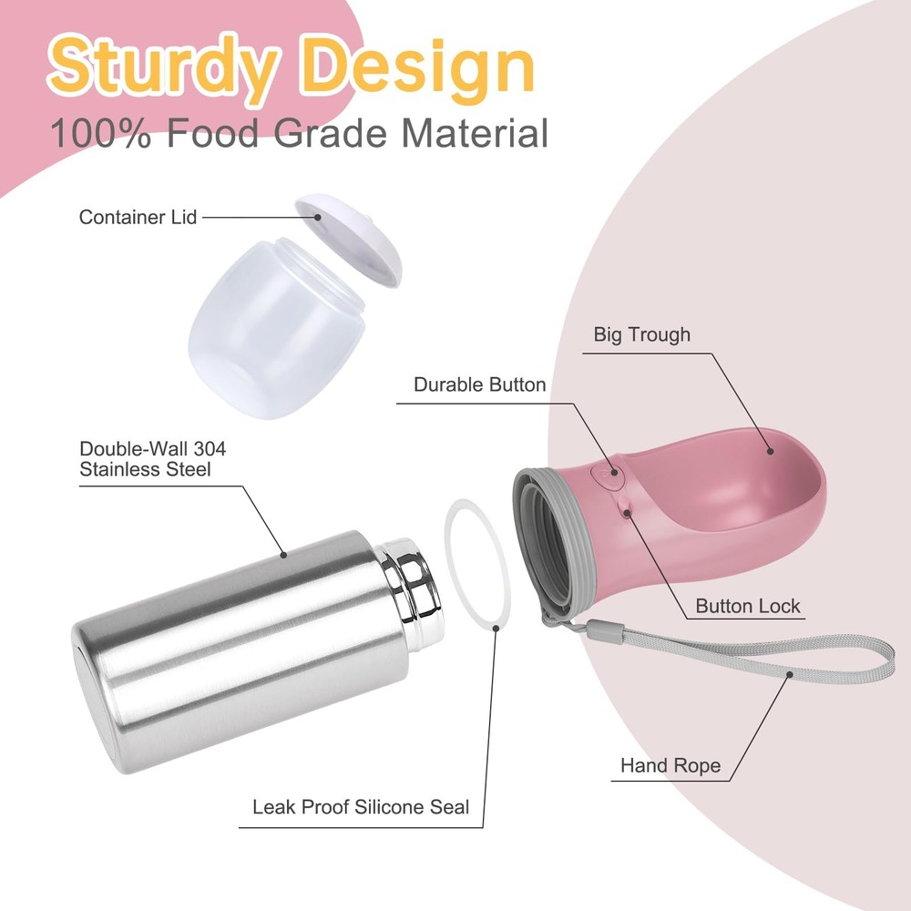Portable Dog Water Bottle Best Travel Companion: A portable dog water bottle is a must-have item for pet owners on the go! The unique design is both user-friendly and dog-friendly. It's perfect for long-time drives, road trips, hikes, walks, and outdoor activities. 2-in-1 Design Dog Water Bottle and Food Container: This pet water bottle can not only hold water, but also store 100 grams of food. Here is a 100g food container closely attached to the bowl of the water bottle. It provides both clean water and fresh food when you go out with your pets. Durable Material: Made of durable stainless steel, LEAD-free, BPA-free, safe and durable. This portable water bottle for dogs is durable and a reliable companion. Leak-proof & Sturdy: It is designed with a silica gel seal ring that efficiently prevents water leakage. Even if you shake it hard, the water will not overflow, so you can put it in your backpack without worrying about it leaking. Quick & Easy to Use: One-key Open / Lock water, press the water key to fill the water, and release to stop the water. This dog water bottle features a convenient one-hand operation and the built-in bowl makes it easy for your dog to drink. Add a button lock to ensure no accidental touch.