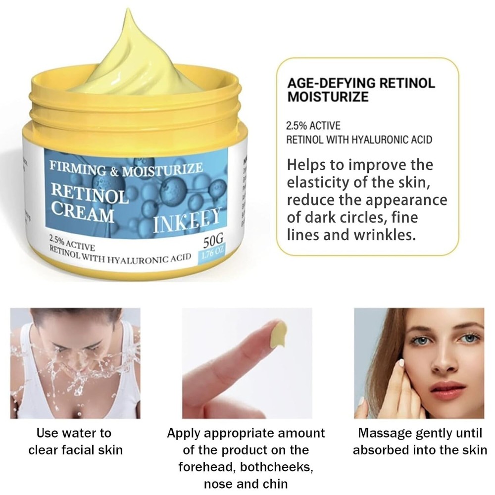 Retinol Moisturizer Anti Aging Cream for Face with 2.5% Retinol Cream, Collagen Retinol Hyaluronic Acid cream, Face Wrinkle Cream for Women Men, Reduce Fine Lines, Deep Hydration Cream 50gm/1.7 fl oz (pack of 1) 【Active Retinol】: This retinol cream for face fights the signs of aging with 2.5% active retinol and super-hydrating hyaluornic acid, leaving the skin smooth, soft, and glowing, retinol night cream for face helping the skin retain moisture for plumped look 【Hydrating and Nourishing】: Anti aging face cream with Hyaluronic Acid deep into the dermis for 16+ hours of hydration, plumps your skin for a healthier, fuller, and younger. Replenish moisture with a bit of help from Aloe Vera, Lemon and Chamomile. Nourish your skin while improving your skins elasticity all at once. Combination of ingredients make this retinol moisturizer for face non-irritating and effective 【Effective Anti-Aging Ingredients】: Face moisturizer for women visibly restore volume to areas prone to sagging and wrinkles. Aloe Vera defends against visible redness and irritation. Sun flower extract and lemon against environmental damage and reduces puffiness. Mens retinol face cream promote a more youthful look and show off a more radiant skin by breaking up the look of sun damage and wrinkles 【Firm Skin, Glow Skin】: Retinol for face helps to improve glow skin and texture, and reduce fine lines, acne, dark circles, wrinkles and sun damage. Anti aging night cream for women Improve the skin texture around the face, eyes and neck, while reducing acne, sunburn and other marks. Retinol collagen face cream increase the firmness and elasticity of the skin 【Light & Non-greasy】: Our anti age face cream for women has a light texture and gets easily absorbed into your skin without feeling sticky or greasy. Anti wrinkle face cream leaves the skin feeling refreshed and non-greasy Note: This Product is designed to deliver optimal results, offering high-quality performance and satisfaction. Please note that individual experiences and outcomes may vary based on personal use, preferences, and unique circumstances. For best results, we recommend following the provided guidelines and ensuring the product is used as intended. Product result may vary for every individual.
