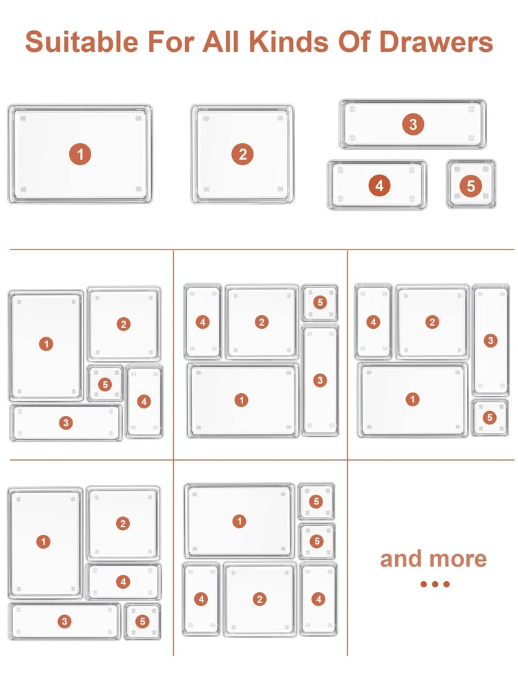 Size: 8.9 x 6 x 2 inches (1 pack), 5.9 x 5.9 x 2 inches(2 packs), 8.9 x 3 x 2 inches(2 packs), 5.9 x 3 x 2 inches(5 packs), 3 x 3 x 2 inches(6 packs) Multiple Sizes - 5 different sizes and 16 pieces trays offer you customize combinations to store stuff and organize drawer for your specific needs. Size: 8.9 x 6 x 2 inches (1 pack), 5.9 x 5.9 x 2 inches(2 packs), 8.9 x 3 x 2 inches(2 packs), 5.9 x 3 x 2 inches(5 packs), 3 x 3 x 2 inches(6 packs). Durable and Non-Slip Material - The drawer organizers made by unbreakable plastic, ensure the long life of use. Silicone non-slip pads at the bottom of the bin prevent the box from moving freely when dragging the drawer. Drawer Space Organizer - Absolutely fit different size drawers, it’s able to use in dresser, office, kitchen and bathroom. Ideal for arranging your toiletries, makeup tools, cosmetic, office supplies, kitchen utensils, jewelry and more. Customize and Stackable Trays - Individual organizer cases can be stacked and sorted out your space easily. Save your Times - Clear drawer organizers can save your time to organize and find your stuff, it’s easy to find and use your items in the drawer, keep your space neat, help you get a neat lifestyle and enjoy more.
