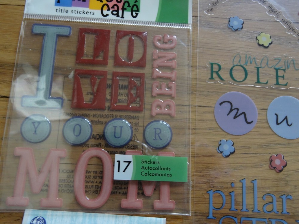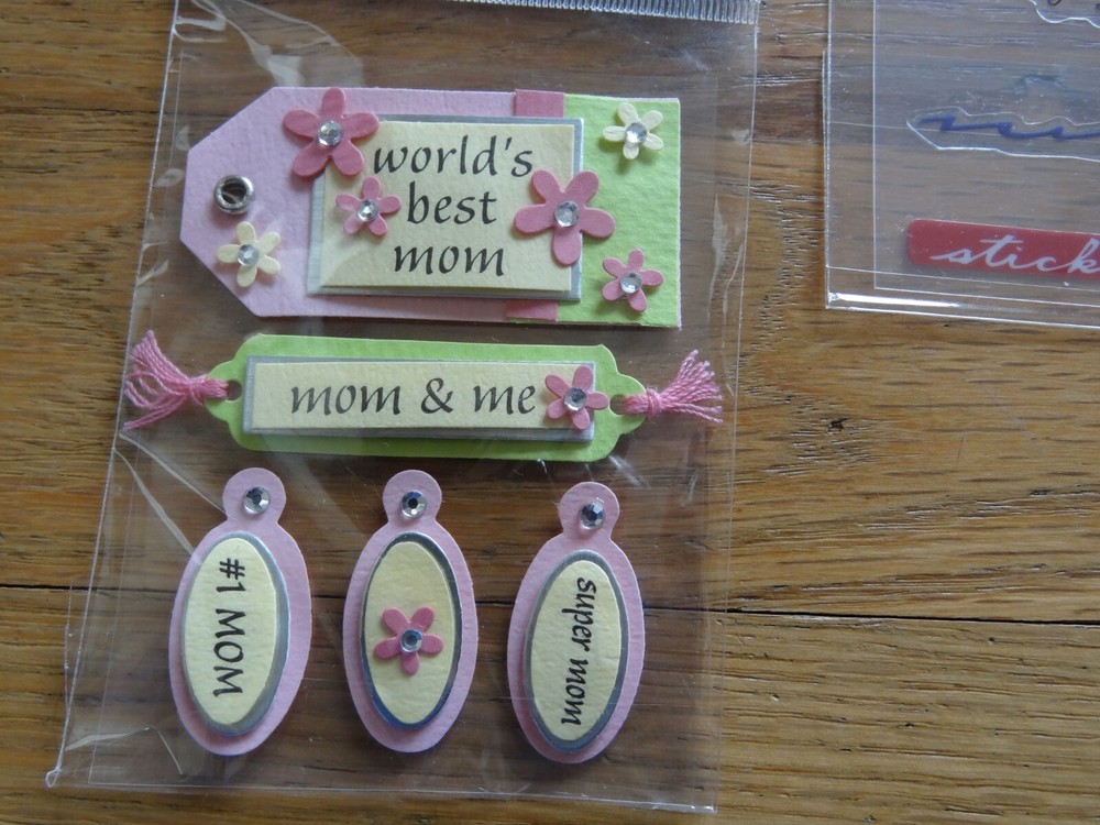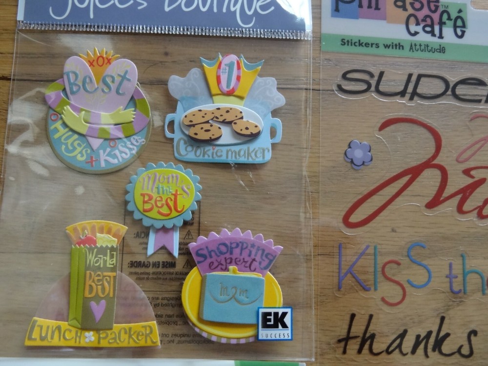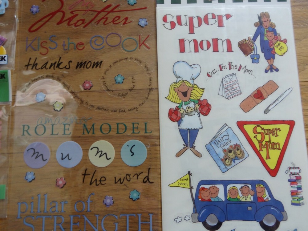 Mothers Day Scrapbooking Sticker set Jolee's Boutique Mother's Day Sandylion Esentials Mom Phrase Cafe Title Stickers Being Your Mom Phrase Cafe Super Mom Sandylion Super Mom New in manufacturer sealed packaging.