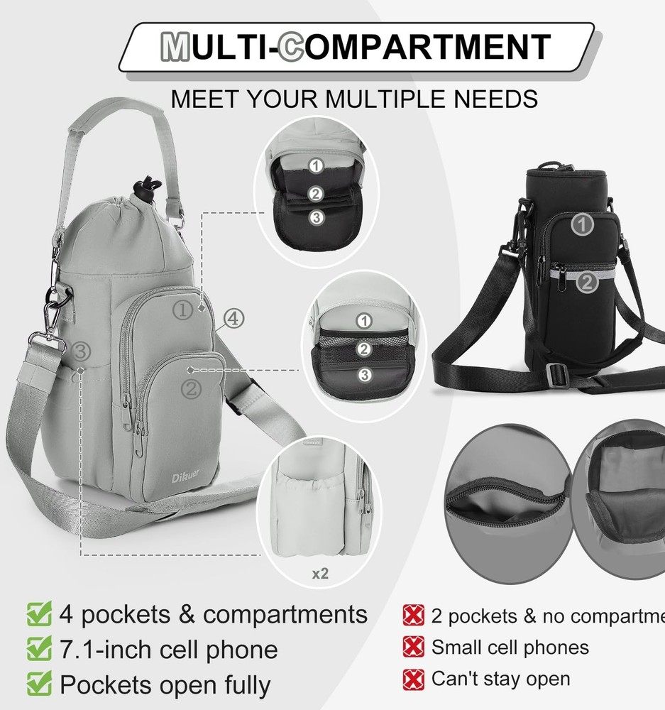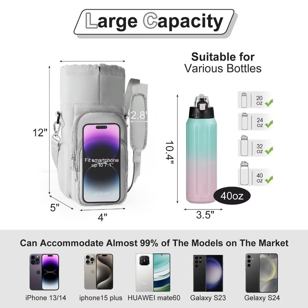 SPD-002 Durable&Water-Repellent -Tired of water bottle sleeves wearing out easily? Our water bottle carrier with strap is made of waterproof-grade polyester fiber, ensuring no trace of liquid is left behind. Furthermore, the metal hooks and zipper components far exceed those of other brands' plastic accessories, offering higher durability and resistance to wear and tear, providing comprehensive protection for your water bottle. Insulated Water Bottle Bag Crossbody -The dimensions of the water bottle sling bag are 4" x 5" x 12", making it suitable for bottles ranging from 32 ounces to 40 ounces. The interior is lined with aluminum foil for efficient insulation, enabling long-lasting heat retention for hot drinks and keeping cold beverages chilled. Now you can enjoy ice-cold refreshments anywhere, anytime during scorching summers or savor a cup of hot coffee while camping in winter. 4-Pocket Organized Storage -The water bottle holder has a total of 4 pockets, including 2 front zippered pockets with 1 card pocket, 2 mesh pockets, and 1 dedicated pocket for phones (fits phones up to 7.1 inches). The 2 side pockets can hold snacks and lip balm. With its diverse and neatly arranged storage space, it is convenient to store and access items such as water bottles, smartphones, purse, cards, and keys etc. Simply wear it and enjoy lightweight travel! MUTIPLE CARRING OPTIONS-Equipped with two detachable shoulder straps, a 13-inch short strap for hand-carrying, and an adjustable 30-58 inch long strap for cross-body or single-shoulder carrying. It can meet the needs of different ages and body shapes, the fashionable color matching brings infinite possibilities to your outfit. The shoulder pad is filled with 5mm padding, ensuring that you won't feel any pressure or discomfort on your shoulders during long-distance wear. MULTI-SITUATION APPLICATION-It features a key hook and an eyeglass hook, making it the perfect choice for hiking, camping, gym workouts, work, travel, walks, and sporting events. It is also the ideal gift for family, friends, and loved ones on holidays and birthdays. Ideal for those who need to stay hydrated on the go but dislike carrying bulky water bottles, allows you to free up your hands while ensuring proper hydration. Embrace ’s water bottle bag just right now!