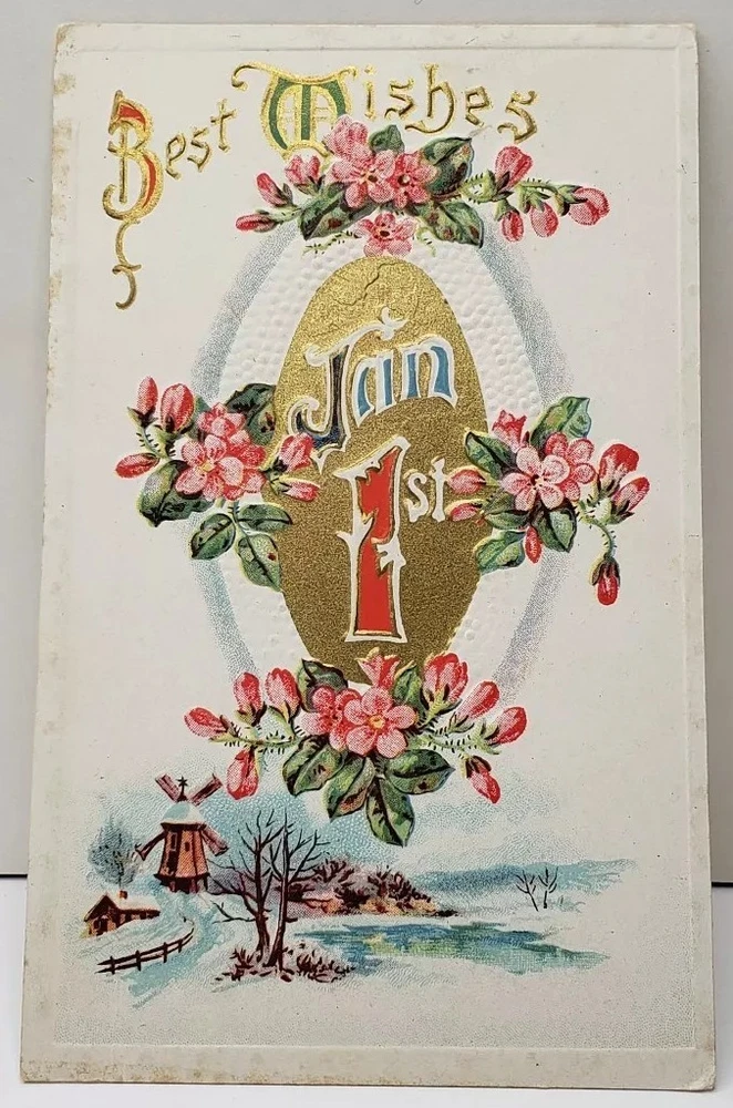 HomeBest Wishes Jan 1st New Years Embossed Flowers Gilded Cameo Postcard F1