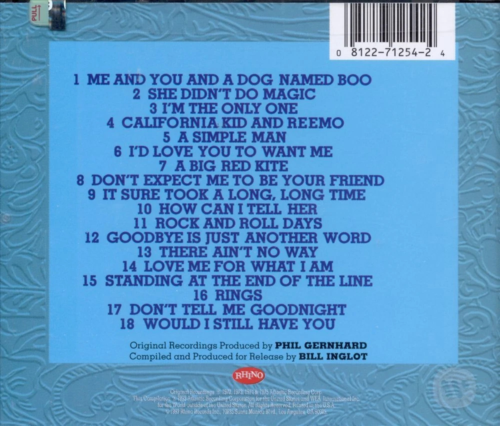 gtin13:0081227125424Country/Region of Manufacture:United StatesItem Weight:0.19 lbFormat:CDUPC:0081227125424Item Width:4.85 inbrand:AtlanticRelease Title:Best ofItem Height:0.39 inItem Length:5.71 inNotes:The song that shot this soft-rocker to stardom- Me and You and a Dog Named Boo - plus 17 others on one CD! It joins his '70s hits I'd Love You to Want Me; Don't Expect Me to Be Your Friend; How Can I Tell Her; Standing at the End of the Line; She Didn't Do Magic; It Sure Took a Long, Long Time; Rings, and more.Tracks:1.1 Me and You and a Dog Named Boo 1.2 She Didn't Do Magic 1.3 I'm the Only One 1.4 California Kid and Reemo 1.5 A Simple Man 1.6 I'd Love You to Want Me 1.7 A Big Red Kite 1.8 Don't Expect Me to Be Your Friend 1.9 It Sure Took a Long, Long Time 1.10 How Can I Tell Her 1.11 Rock and Roll Days 1.12 Goodbye Is Just Another Word 1.13 There Ain't No Way 1.14 Love Me for What I Am 1.15 Standing at the End of the Line 1.16 Rings 1.17 Don't Tell Me Goodnight 1.18 Would I Still Have YouRecord Label:Atlantic, ATLNumber of Tracks:18Artist:LoboGenre:RockNumber of Discs:1Release Year:1993
