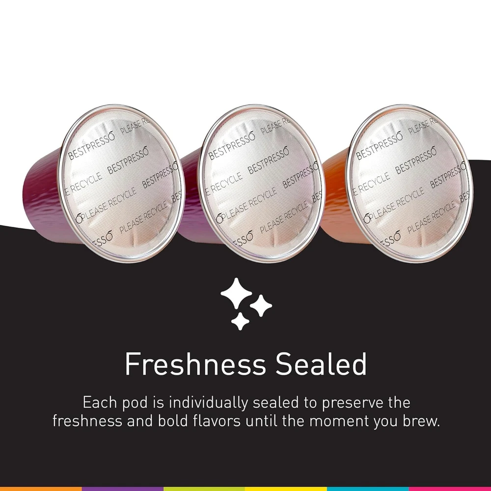 Bestpresso Coffee For Nespresso Original Machine 120 20 Count (Pack of 6) Description Features: Get a kick out of the distinctive flavor and creamy body of authentic Italian espresso. Kosher certification: this product is certified kosher by the orthodox union. Coffee capsules compatible with Nespresso Original coffee machines High quality 100% natural & unique espresso in convenient Nespresso compatible pods 6 boxes, containing 20 capsules each, 120 capsules total No preservatives, no sugar or flavoring added, Over 50% Rainforest Alliance Certified Sustainable coffee in support of small coffee producers. Product from Spain Product Details: Product Dimensions : 10.7 x 10 x 5.3 inches; 2 Pounds Item model number : BST06106 Manufacturer : Bestpresso Units : 120 Count Brand: Bestpresso Item Form: Capsule Flavor: intense variety pack Caffeine Content Description: Decaffeinated Roast Level: Dark Roast Handling We will ship all orders within 1 business day of payment. Delivery We Do Not Ship Outside of the Continental US. Return Policy All items qualify for returns within 30 days of receipt. Buyer is responsible for return shipping on any item that is not damaged. Feedback We take our reputation seriously, we buy and sell online, so we understand the value of trust. If you are unsatisfied with your order, please contact us and we will work with you to resolve it to your satisfaction.