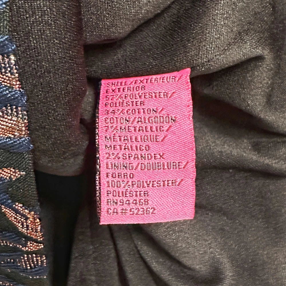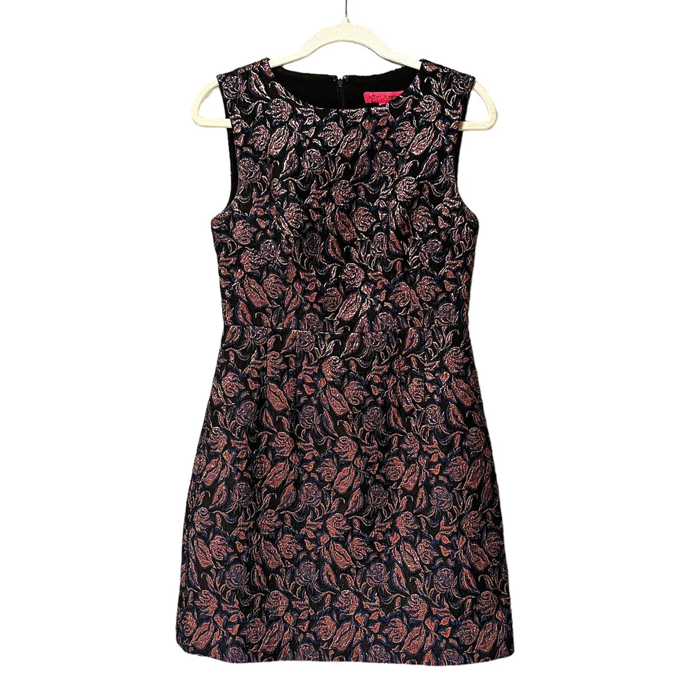 Sumptuous texture, a sophisticated color combination, all in a classic silhouette—what's not to love? - Metallic floral pattern - Boat neckline - Wide straps (bra friendly!) - Defined waist - Straight skirt - Hits above the knee - Fully lined - 57% polyester / 34% cotton / 7% metallic / 2% spandex - Size 4 Excellent condition, no flaws to note!