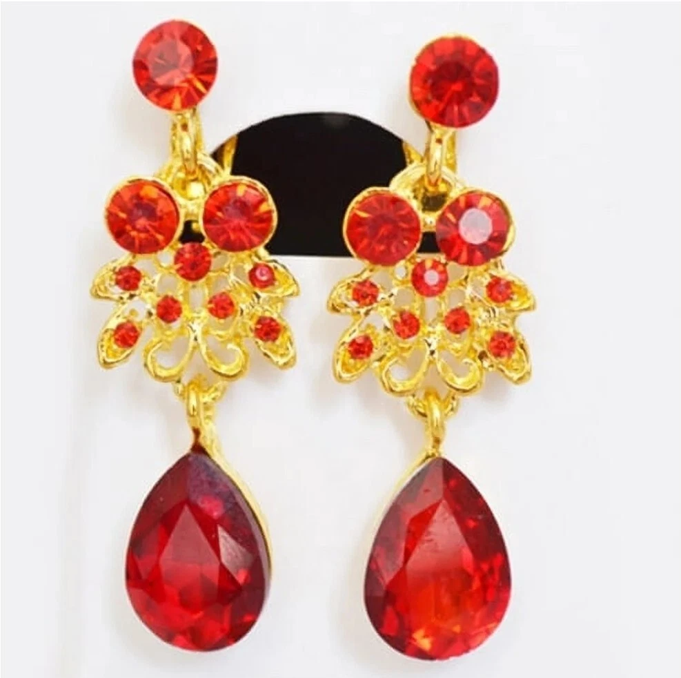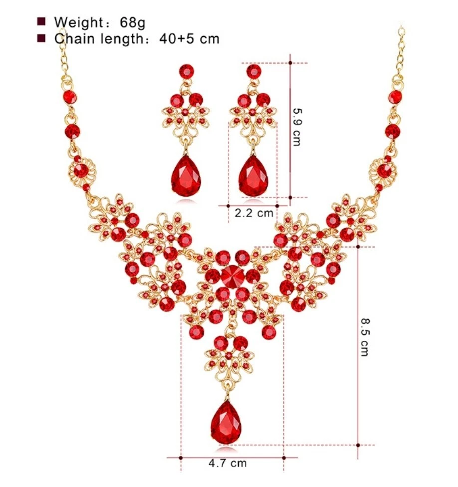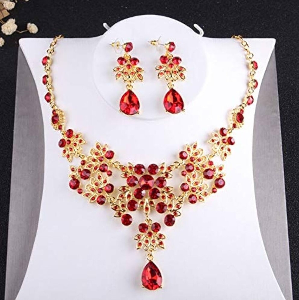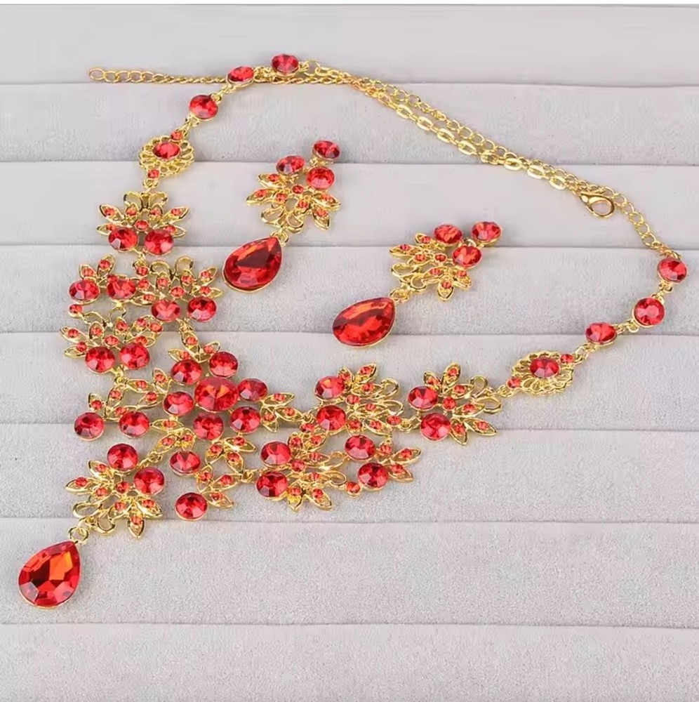 Elevate your jewelry collection with this stunning Betsey Johnson Gold Red Crystal Floral Necklace Earring Set. The set includes a beautiful round-shaped necklace and matching earrings, adorned with vibrant red crystals and rhinestones. The yellow gold-plated metal adds an extra touch of elegance to the set, making it perfect for any occasion. The necklace and earrings are of excellent cut, showcasing a brilliant and sparkling finish. The set brand Betsey Johnson. It is a perfect gift for your loved ones or a lovely treat for yourself.