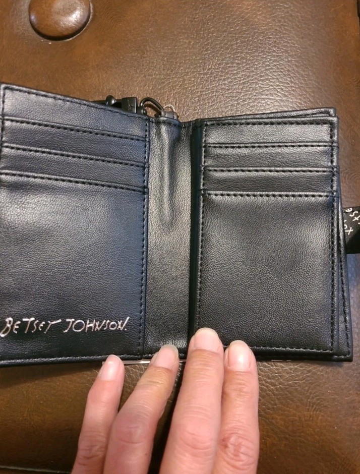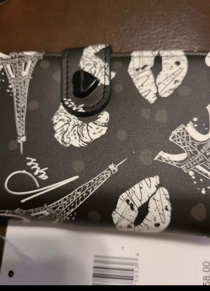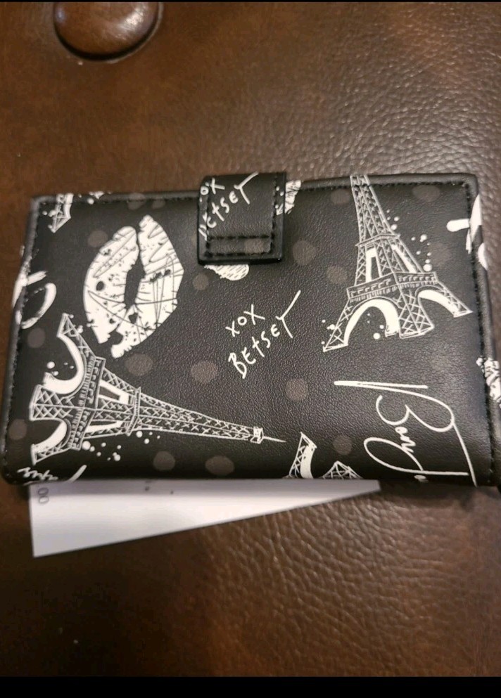 NWT BETSEY JOHNSON BLACK AND WHITE PARIS WALLET. HAS EIFFEL TOWER, CROSSAINTS, LIPS, XOX BETSEY, PARIS, BON JOUR ON IT. BLACK LOGO HEART SNAP CLOSURE. INSIDE FIRST SECTION HAS 6 CARD SLOTS AND 2 OPEN SLIT POUCHES AND HAS SILVER BETSEY JOHNSON LOGO WRITTEN ON IT. NEXT SECTION HAS 5 CARD SLOTS WITH 2 OPEN SLOT POUCHES BLACK METAL KEY CHAIN HOLDER WITH XOX BETSEY ON IT. APPROXIMATELY 5" W ร 3.5" L RETAILS FOR $58.00