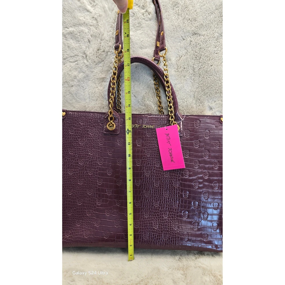Make a bold luxury statement with this NWT Betsey Johnson Plum Skull Croc Embossed Tote, a rare collector-style piece featuring an all-over raised skull pattern pressed into glossy croc-embossed vegan leather. The deep plum color paired with chunky gold chain straps gives this tote a premium, edgy-luxe feel—exactly what Betsey fans love. Oversized and structured, it easily fits a laptop, notebooks, or daily essentials, making it perfect for work, travel, or stylish everyday carry. Interior is lined with Betsey's signature "XOX Betsey" print and includes an interior pocket plus a magnetic closure. Measurements: approx. 17" W × 13.5" H × 5.5" D Brand new with tags. Smoke-free home. Ships fast and packaged with care. Retails $118 — grab it NEW for less.t.