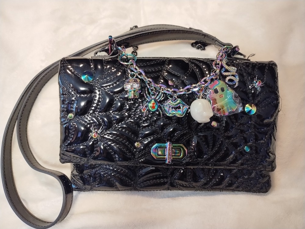 New without tags Betsey Johnson crossbody. Come with a detachable charm bracelet and strap. The hardware and accents are "oil slick" color. The front has spider and stud accents, and the Betsey Johnson signature on back. Discontinued in the U.S.