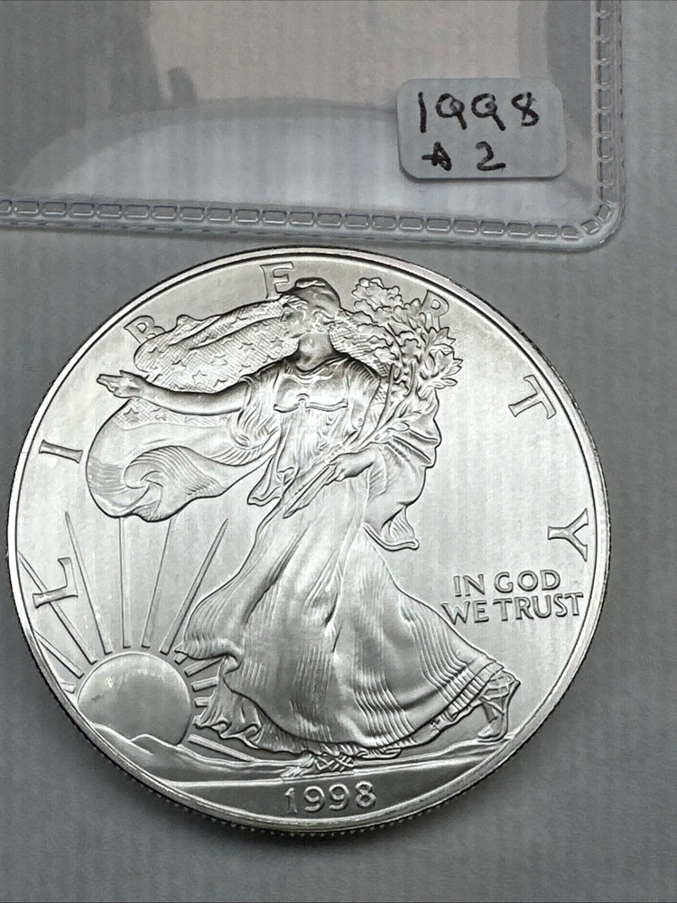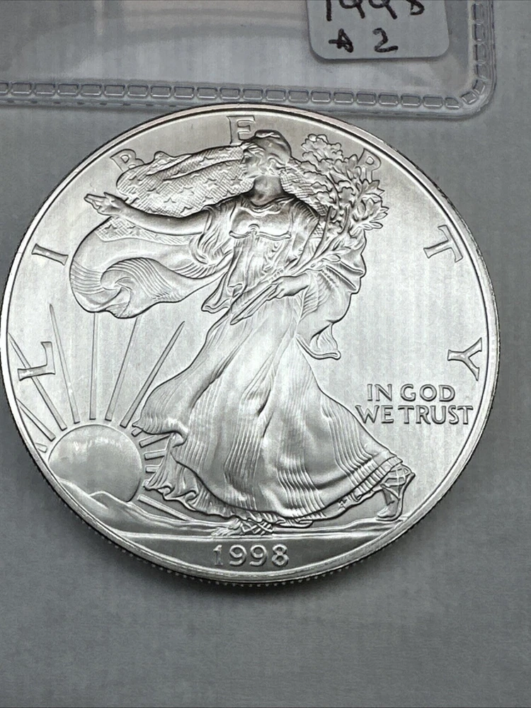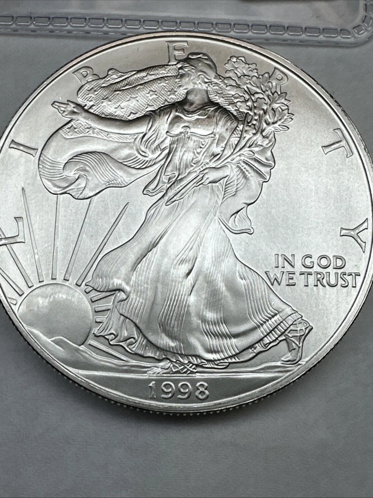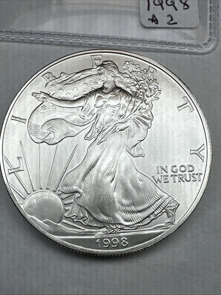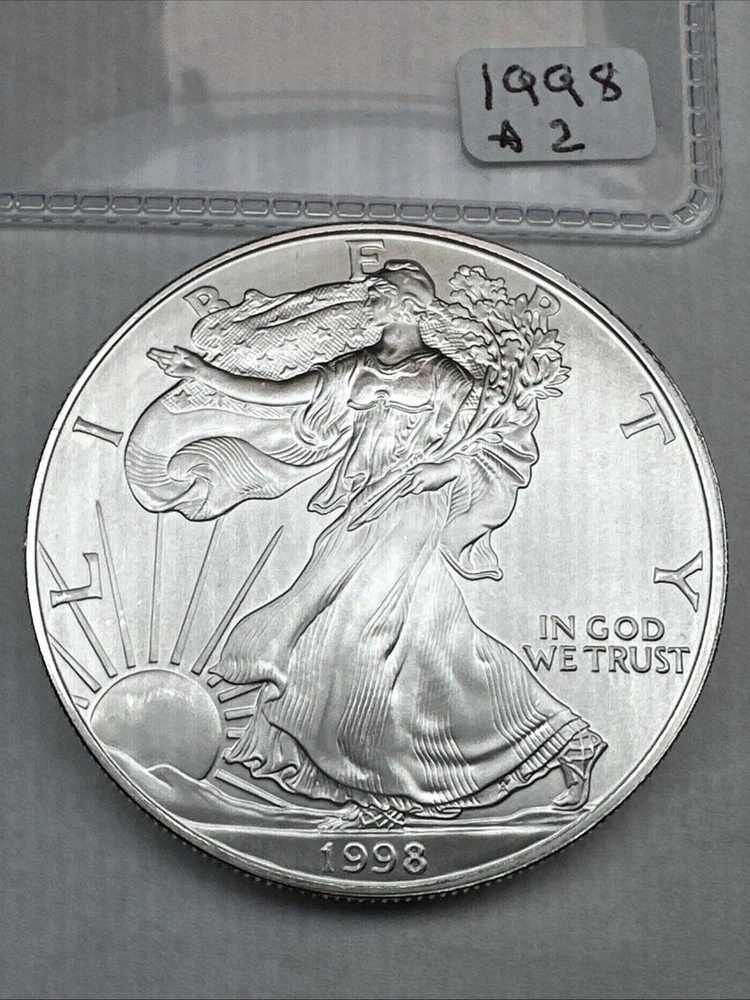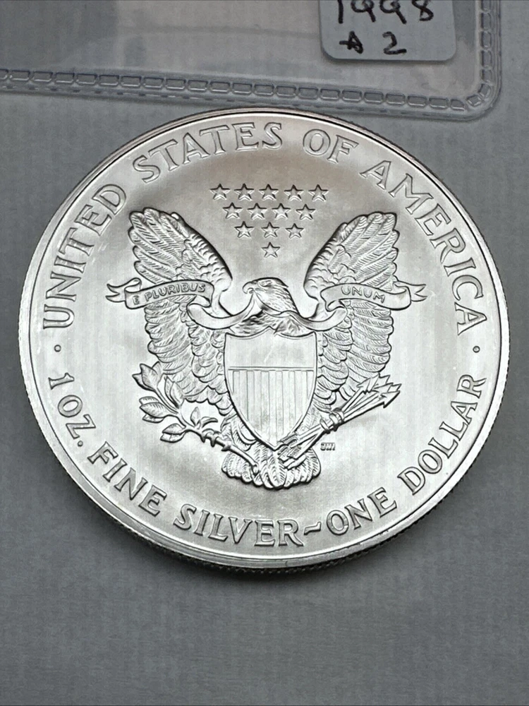 This is a 1998 American Silver Eagle coin, minted by the U.S. Mint in Philadelphia. It contains 1 troy ounce of .999 fine silver and has a denomination of $1. The coin is uncirculated and has not been certified. This particular date is considered a better date for collectors.