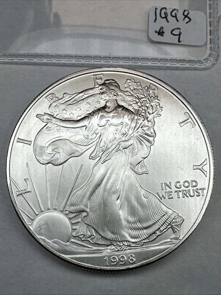 This is a 1998 American Silver Eagle coin minted by the U.S. Mint in Philadelphia. It contains 1 troy ounce of .999 fine silver. The coin features a striking business strike type and is in uncirculated condition. It has a denomination of $1 and is part of the American Eagle series. This coin is a better date variant and is uncertified.