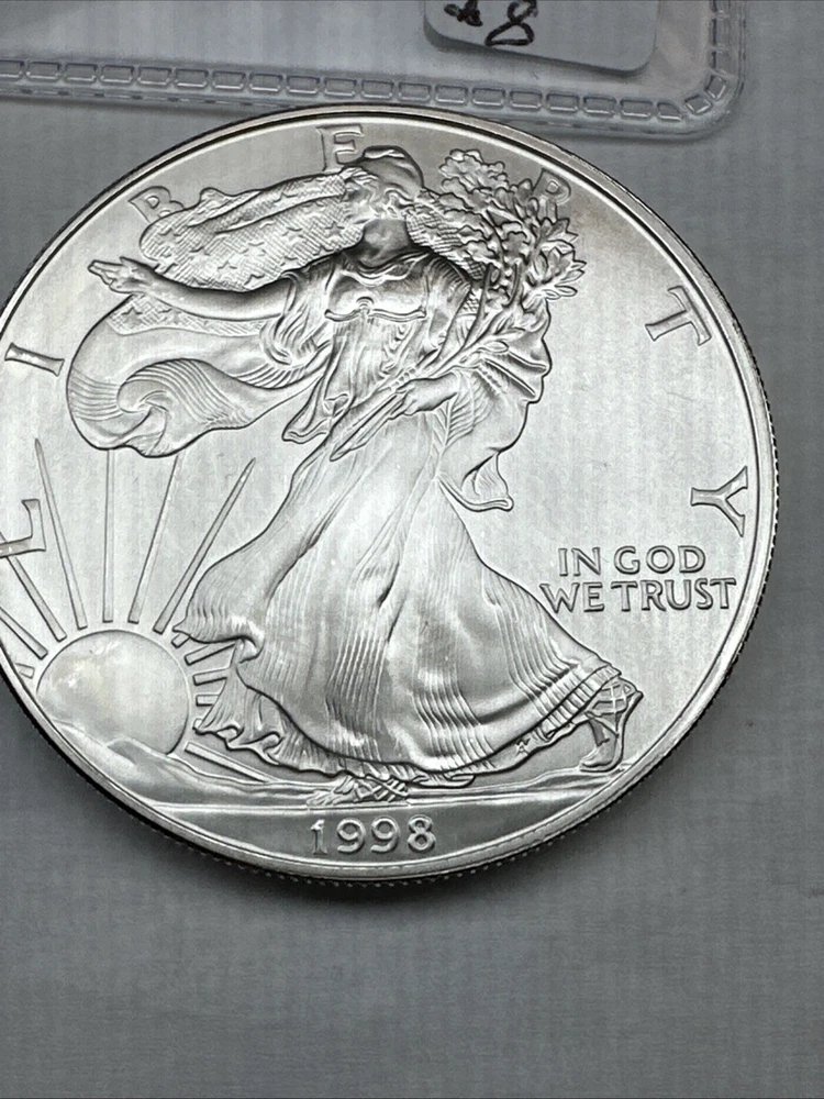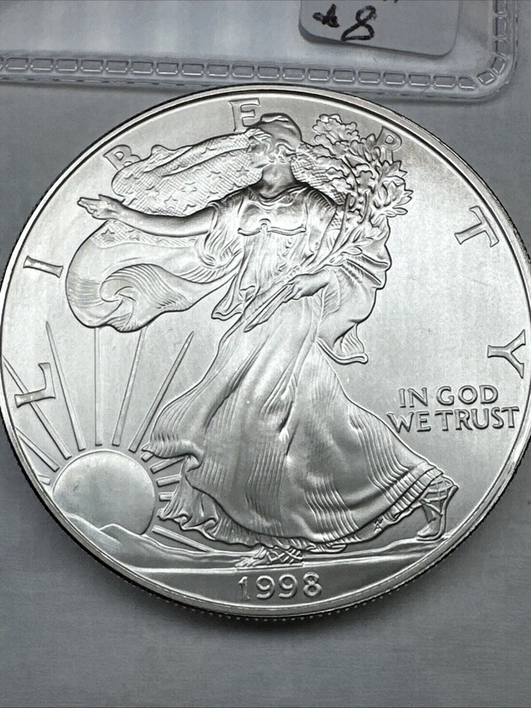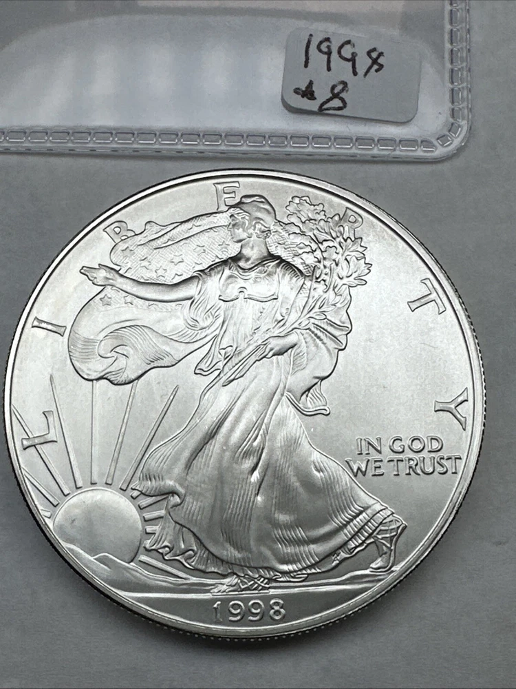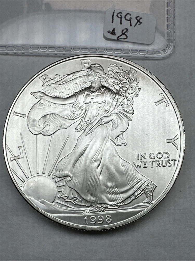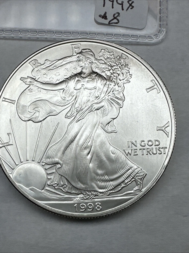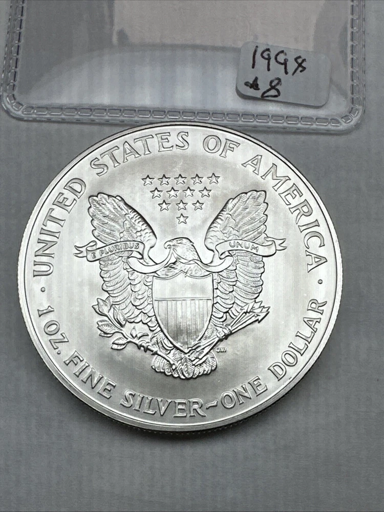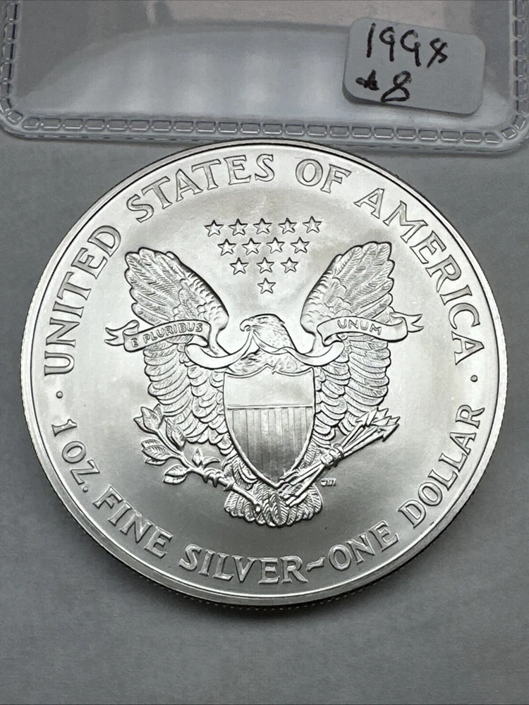 Grade: Ungraded Fineness: 0.999 Circulated/Uncirculated: Uncirculated Brand/Mint: U.S. Mint Country/Region of Manufacture: United States Certification: Uncertified Composition: Silver Denomination: $1 Total Precious Metal Content: 1oz Mint Location: Philadelphia Precious Metal Content per Unit: 1 oz Year: 1998 Strike Type: Business Coin: American Eagle