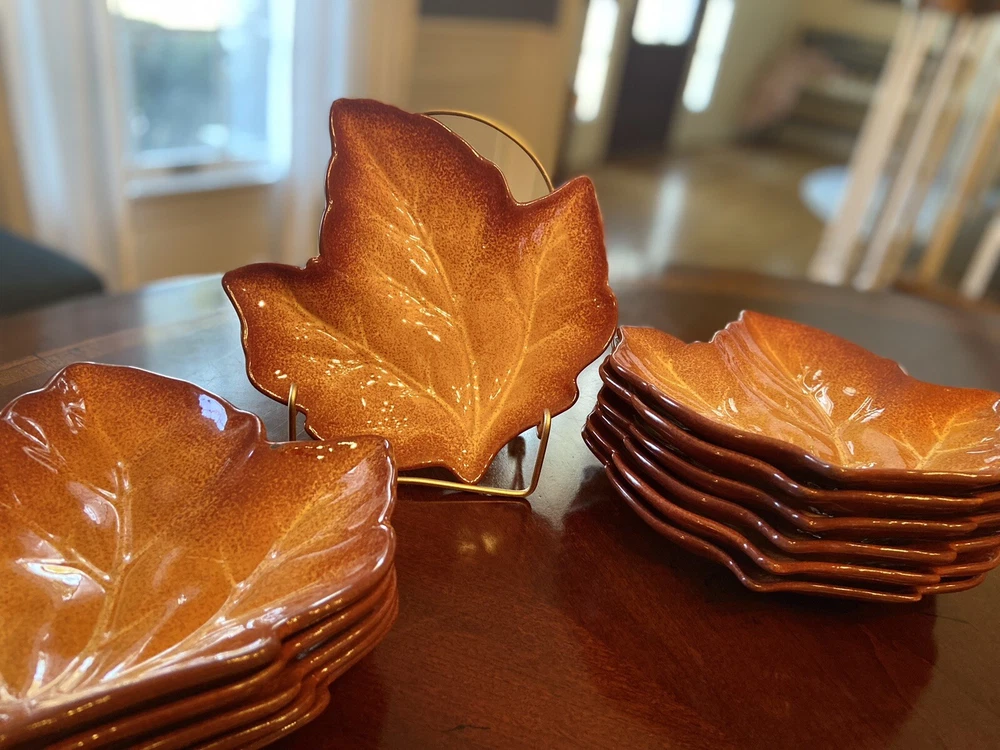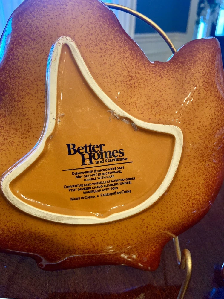 Add a touch of autumnal charm to your dining table with this Better Homes And Garden Maple Leaf Salad Plates. The plate features a beautiful orange leaf pattern that's perfect for all occasions. Made of glossy ceramic material, this vintage plate is 8.5" long and 8" wide, making it the ideal size for serving your favorite salad. The plate has a printed backstamp and is designed with a leaf shape. Ideal for collectors and those who appreciate unique dinnerware, this plate is a must-have addition to your collection. Perfect condition- no chips, cracks or crazing.