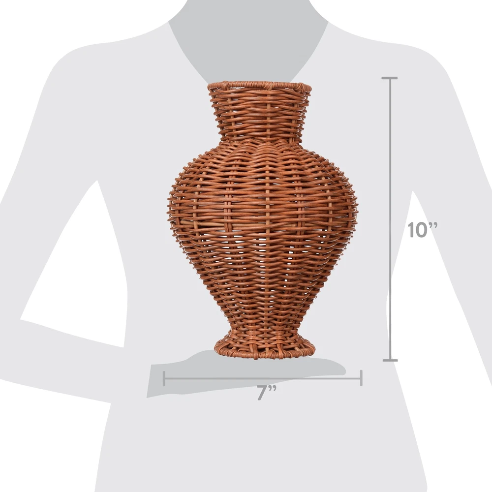 About this item Basketweave vase Features woven rattan-inspired design Made with faux rattan (synthetic) Dimensions: 7.1-inch diameter and 10-inch height Suitable for displaying dried and faux plants – vase cannot hold water Decorative vase for your entryway, dining room, living room, and more Care instructions: Wipe clean as needed.