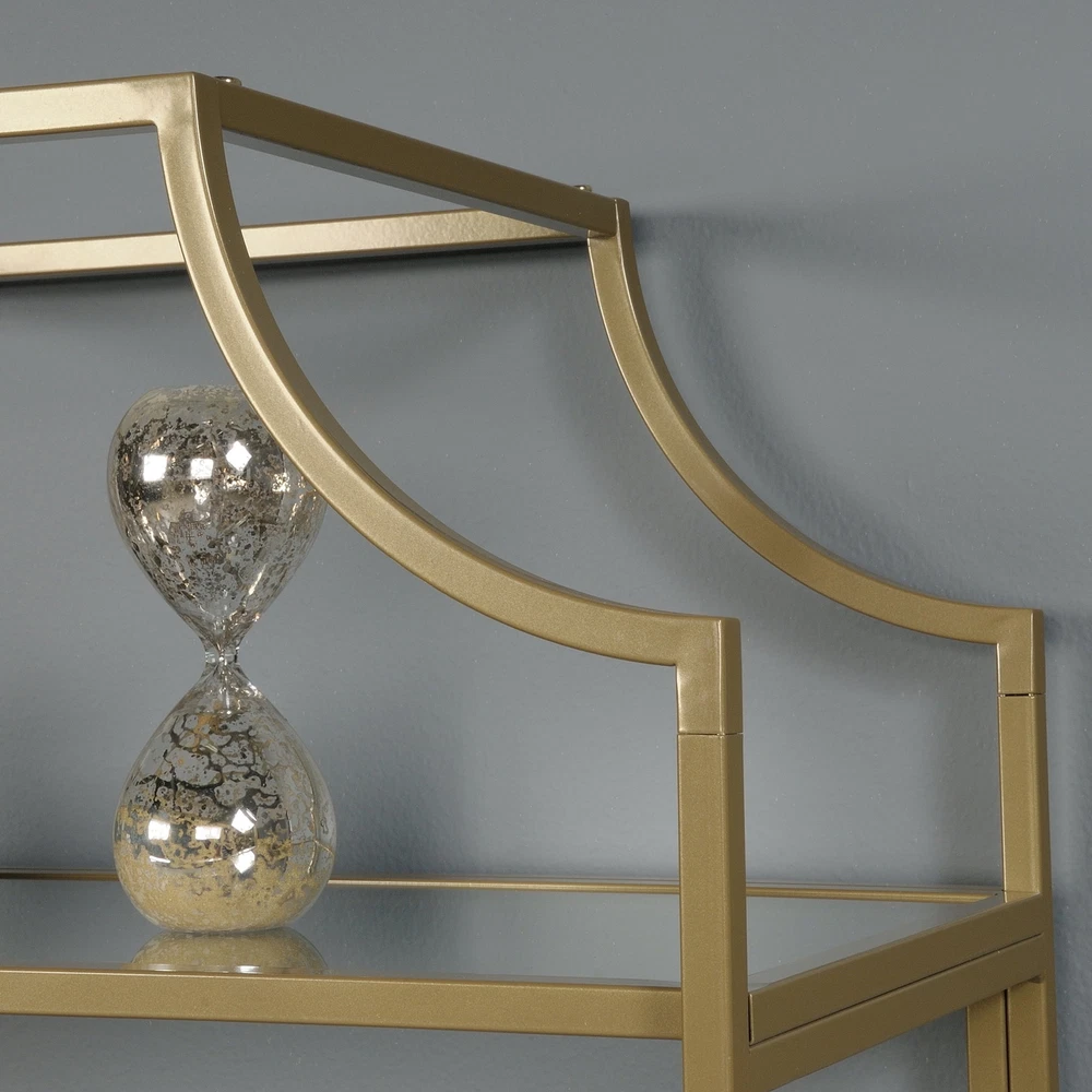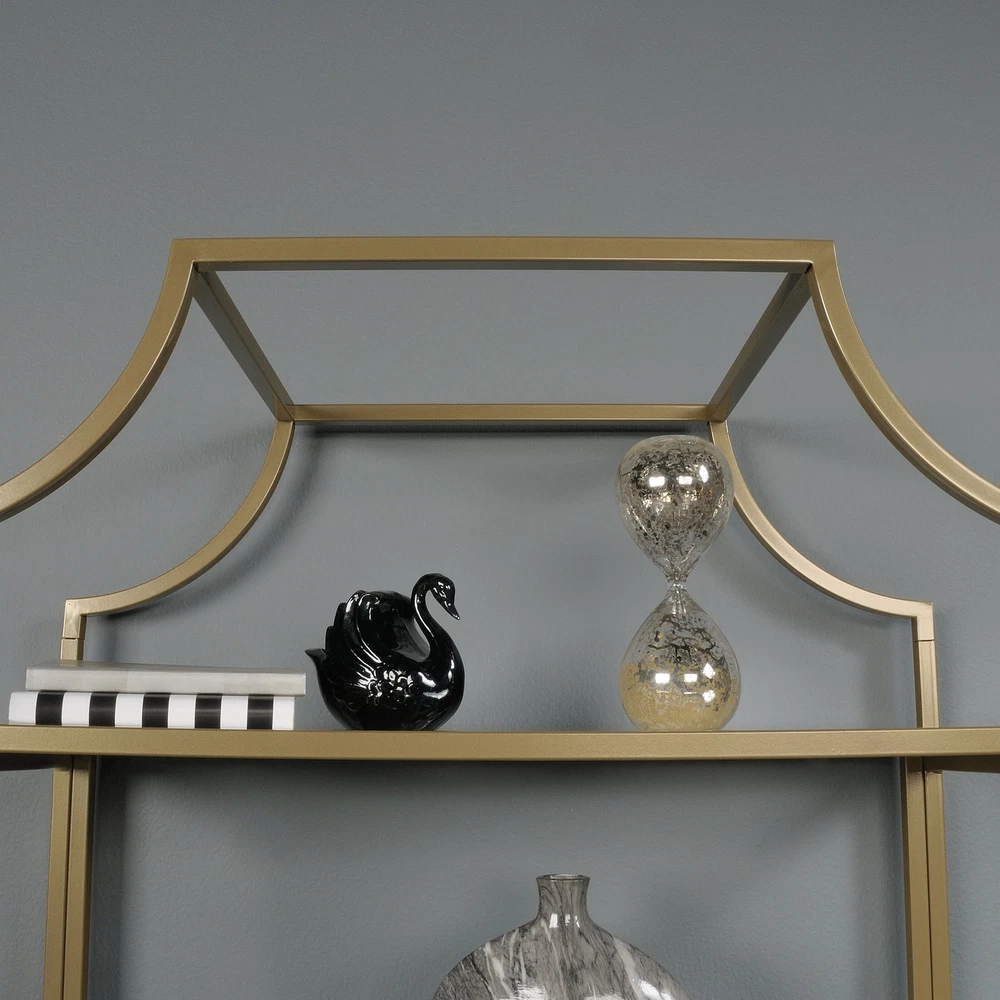 All that glitters is gold. Become a shooting star and break the mold by adding a touch of luxurious style to your living space with this exquisite multi-tiered bookcase from the Nola collection. This multi-tiered bookcase features five open shelves, each with a safety tempered glass surface, adding a touch of style to your home decor. These glass shelves are the perfect place to store books, folders, and other household essentials. Switch it up and use it as a display area to showcase photos of your family, a vase filled with flowers, or any other items that are most precious to you in life. Its rounded edges and curved indented design give it a stunning and unique look that is sure to catch the attention of your friends and family. Made of solid metal with a gold-plated , this sleek and elegant bookcase adds a classic beauty to any room and lets you live in luxury. Be sure to check out the Better Homes & Gardens Nola collection for more great items! Assembled dimensions: 30.00"L x 14.49"W x 70.87"H Open shelving for storing and displaying books, binders, photo frames, collectibles, and more Safety tempered glass shelves for added detail Metal construction for durability Model: 422296 Box dimensions: 65.75"L x 17.13"W x 6.89"H