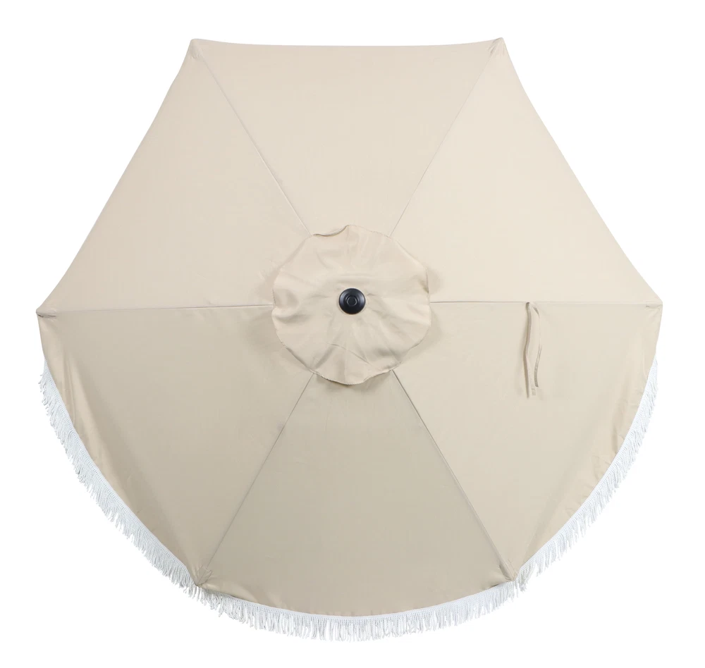 The Better Homes & Gardens outdoor 7.5 foot round market patio umbrella features a manual push-up function to open the canopy. The fade-resistant canopy is made with Scotchgard treated 50% recycled polyester fabric and a powder coated steel frame. For use either through a table with a 26lb base or freestanding with a 75 lb. base. Please insure you always use an umbrella base to secure your umbrella and close when not in use to prevent damage. Push the umbrella upward for easy opening Does Not Tilt Fabric made from fade-resistant 50% recycled polyester fabric Durable and strong powder-coated steel frame and 6 steel ribs helps extend the life of the umbrella Steel safety pole protects fingers from being pinched Supplies enough coverage for a 4 person table Can be used either through a table with a 26lb base or freestanding with a 75lb base Base not included Care: Spot clean with mild soap and water, do not bleach Overall dimension: 90.5" x 86.6" x 86.6" (L x W x H) Product weight:10 lbs On Feb 18, 2025 at 19:59:35 PST, seller added the following information: