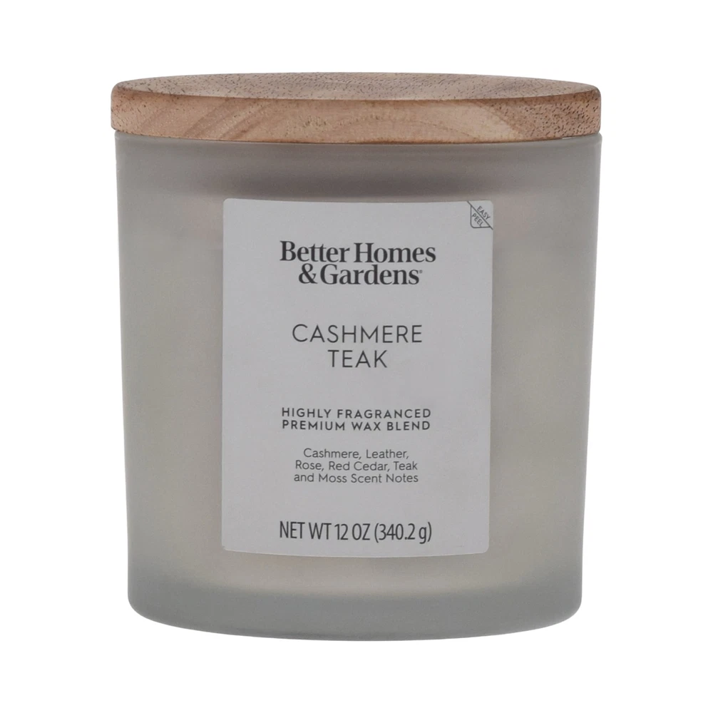 Better Homes & Gardens Cashmere & Teak 12oz 2-Wick Candle - This 2-Wick candle emanates a warm, golden light, filling your space with an indulgent fragrance. Citrus-infused aldehydes brighten warm shades of brushed suede and wooly cashmere, enriched with white rose accents, red cedar, rich moss, and sparkling musk. Housed in a frosted glass jar with a printed wooden lid, it features a specially crafted paraffin wax blend ideal for various settings and décor styles. Crafted with care, the candle ensures a consistent burn experience, emitting a warm, golden light that transforms any room. Versatile and contemporary, its frosted printed glass design seamlessly integrates with your existing décor. Elevate your space with sophistication and style. Explore our collection now to discover the perfect addition for enhancing your home ambiance. 12oz 2-Wick Jar Candle: This candle comes in a substantial 12-ounce jar with two wicks, ensuring a long-lasting and even burn. Specially Crafted Blended Wax: The candle is filled with a specially crafted blended wax that is hand-poured, guaranteeing a consistent and pleasant burn experience. Stylish Design: The contemporary frosted printed glass design, topped with a wooden lid, complements various settings and adds a touch of style to your decor. Wooden Lid: The wooden lid not only adds a decorative element but also helps keep the candle clean and preserves the fragrance when not in use. Warm, Golden Light: When lit, this candle emits a warm, golden light that enhances the cozy atmosphere of any room. Hand-Poured for Quality: The paraffin wax is hand-poured, ensuring attention to detail and quality in every candle, making it a delightful addition to your home. Versatile Decor: The versatile design of the frosted printed glass jar allows you to place it in various settings, seamlessly blending with and enhancing your existing décor Burn Time: With two wicks and an 12-ounce size, this candle offers an 40 hour burn time, allowing you to enjoy its inviting fragrance for longer periods.