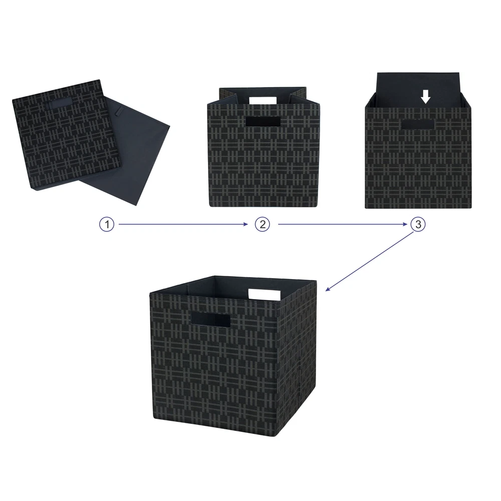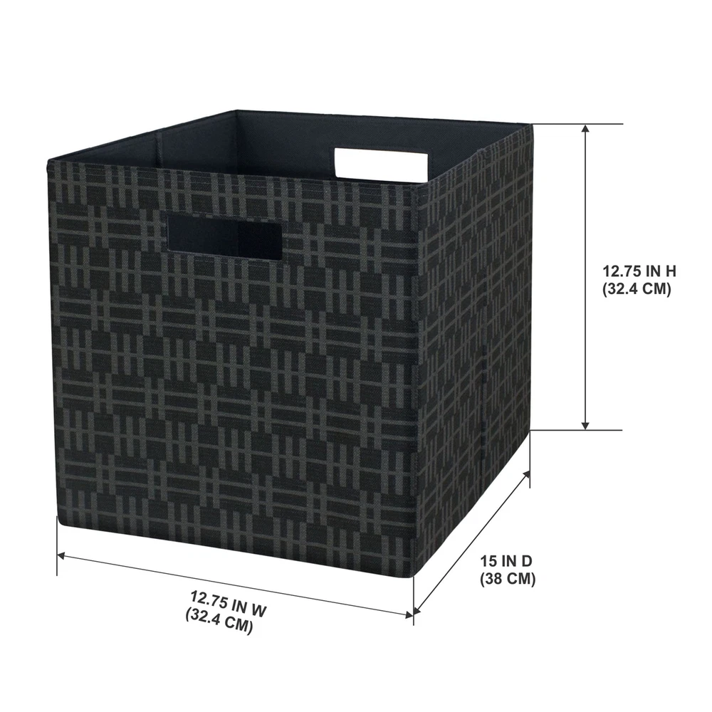 Item Width: 15.00 in Style: Contemporary gtin13: Does not apply Shape: Square Brand: Unbranded Color: Black Item Length: 12.75 in Features: Non-Lidded, Stackable, With Handles UPC: Does not apply Mounting: Free Standing Type: Storage Basket Material: Fabric Country/Region of Manufacture: United States Item Height: 12.75 in