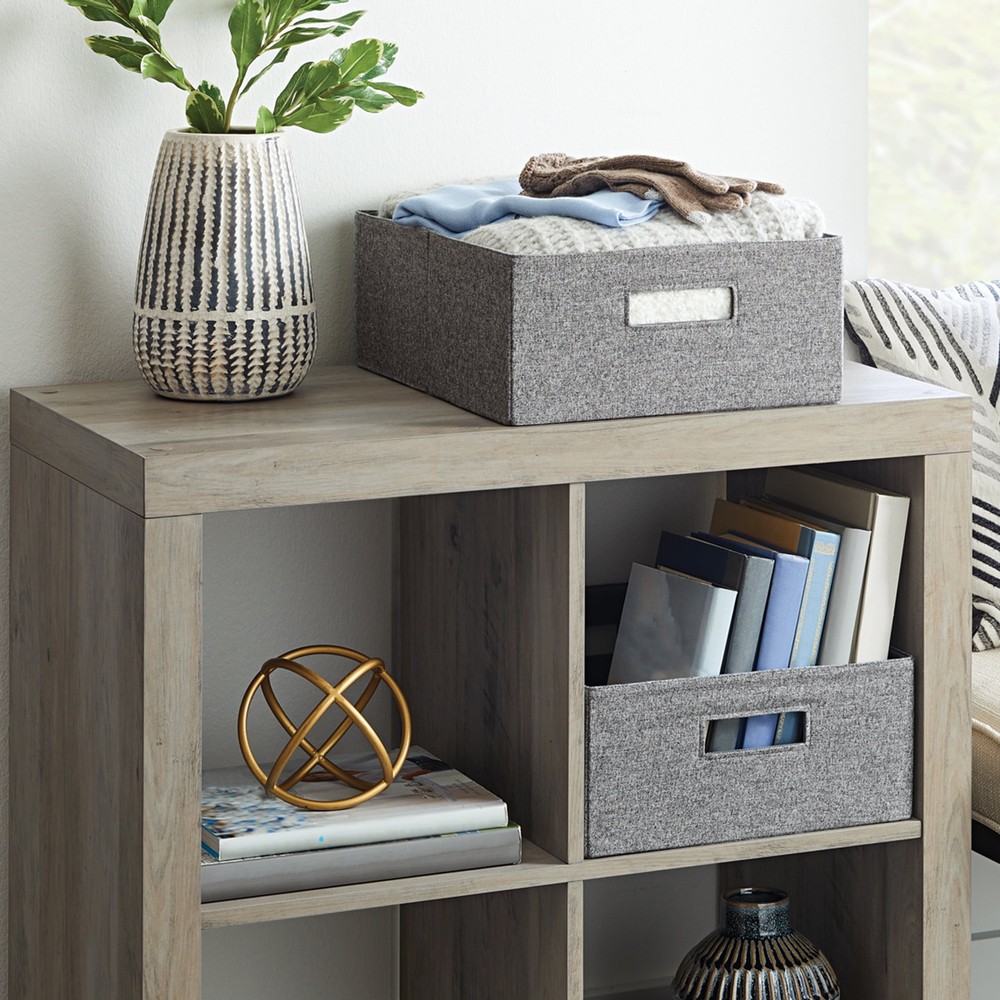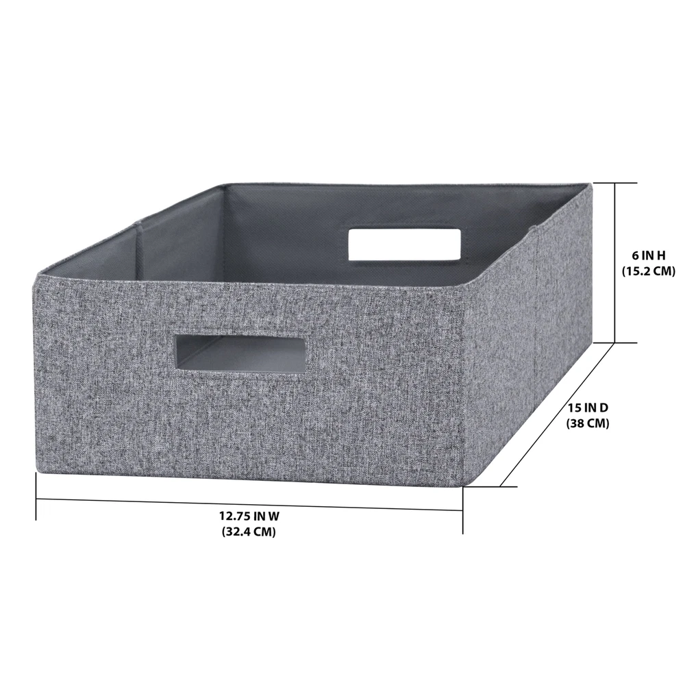 These Better Homes and Gardens Gray Half-Size Fabric Cube Storage Bins are a versatile and indispensable item for your home, office or small business. You can use them to store documents, files, toys, , supplies, small equipment, kids to adult clothes and much more. This storage bin measures 12.75" x 6" x 15"with two handles to make it easy to carry and transport them. With a variety of colors to choose from, you'll be able to perfectly match your home decor when you get organized with our Better Homes & Gardens Fabric Cube Storage Bins. Includes 2 storage cubes These collapsible, easy-to-carry bin is a great way to keep magazines, books, toys, craft supplies, kids or adult clothes, and other smaller items organized With two handle cut outs, you can easily transport this bin from room to room without fuss Can be used with our Better Homes & Gardens cube organizers (sold separately) or independently Can be used with our Better Homes & Gardens cube organizers (sold separately) or independently Also available in Gray, Black, Tan and Ivory Dimensions of storage bin: 12.75" Wide x 6" Height x 15" Deep