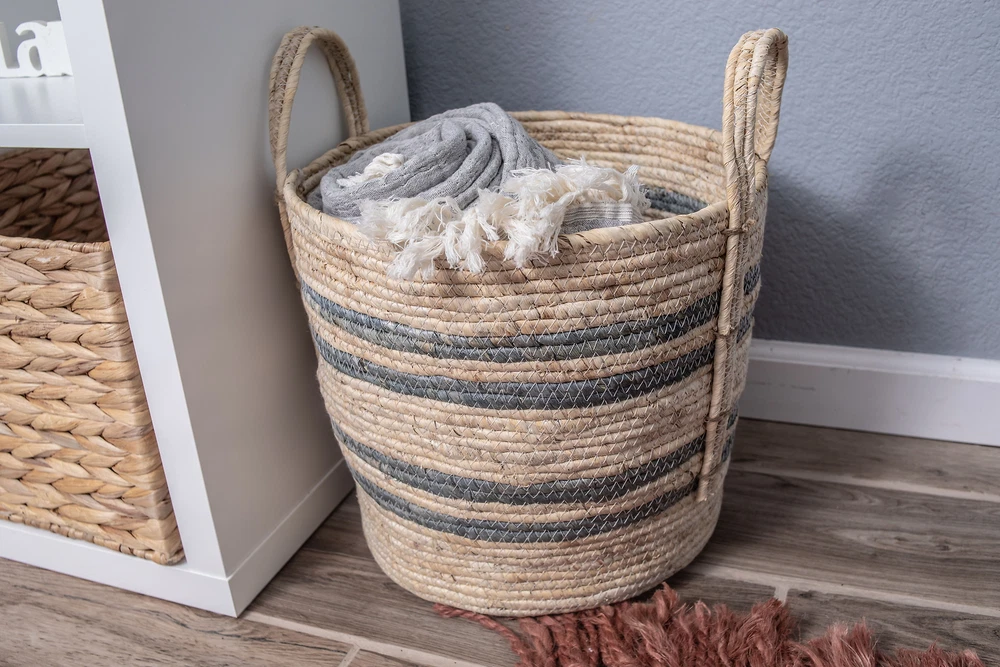Keep your home organized and looking great with the Better Homes & Gardens Large Natural Maize Basket. Whether you place the basket in your living room, den, bedroom, bathroom or entryway, the woven basket will help bring softness, color and depth to your room. Perfect for magazines, books, toys, blankets, pillows or towels, the natural maize fibers bring texture to your space, blending with any decor and the jute woven handles make for easy lifting. The Large Blue Gray Natural Maize Basket is the perfect choice to keep your space clean and organized. Keep your home organized and looking great with the Better Homes & Gardens Large Natural Maize Basket. Whether you place the basket in your living room, den, bedroom, bathroom or entryway, the woven basket will help bring softness, color and depth to your room. Perfect for magazines, books, toys, blankets, pillows or towels, the natural maize fibers bring texture to your space, blending with any decor and the jute woven handles make for easy lifting. The Large Blue Gray Natural Maize Basket is the perfect choice to keep your space clean and organized. On Feb 16, 2025 at 23:08:29 PST, seller added the following information: