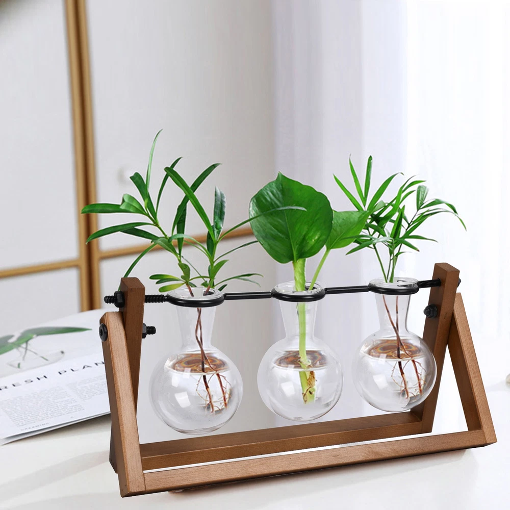 Better Homes & Gardens 3 pack Propagation Station design wood rack in natural retro color combined with 3 bulb-shaped glass vases. Perfect for desk or coffee station table without taking up much space. Plant your beloved plants or cuttings, when you are tired at work, you can relax your eyes with green plants at any time. The frame is made of natural wood, which is strong and durable. The bulb vase is made of high-quality borosilicate glass. Design to provide a better growth environment for your plants. A stylish way to display the artificial or fresh flowers, plant cuttings, mixed bouquets and water rooted plants. This lovely propagation stand is the best gift for plant lovers. Please plant your favorite plants in this product, please do not directly expose the glass ball filled with water to the sun. Made of clear glass and sturdy wood frame Size: 11.3 in L x 4.3 in W x 5.5 in H No assemble needed 1 wood stand and 3 glass vases included Note: Glass is fragile, please treat them carefully when using Please plant your favorite plants in this product, please do not directly expose the glass ball filled with water to the sun.