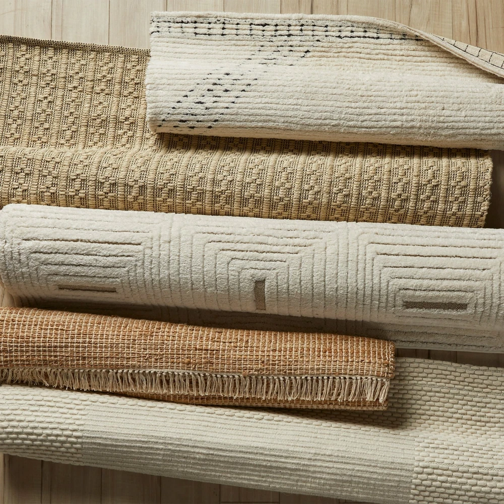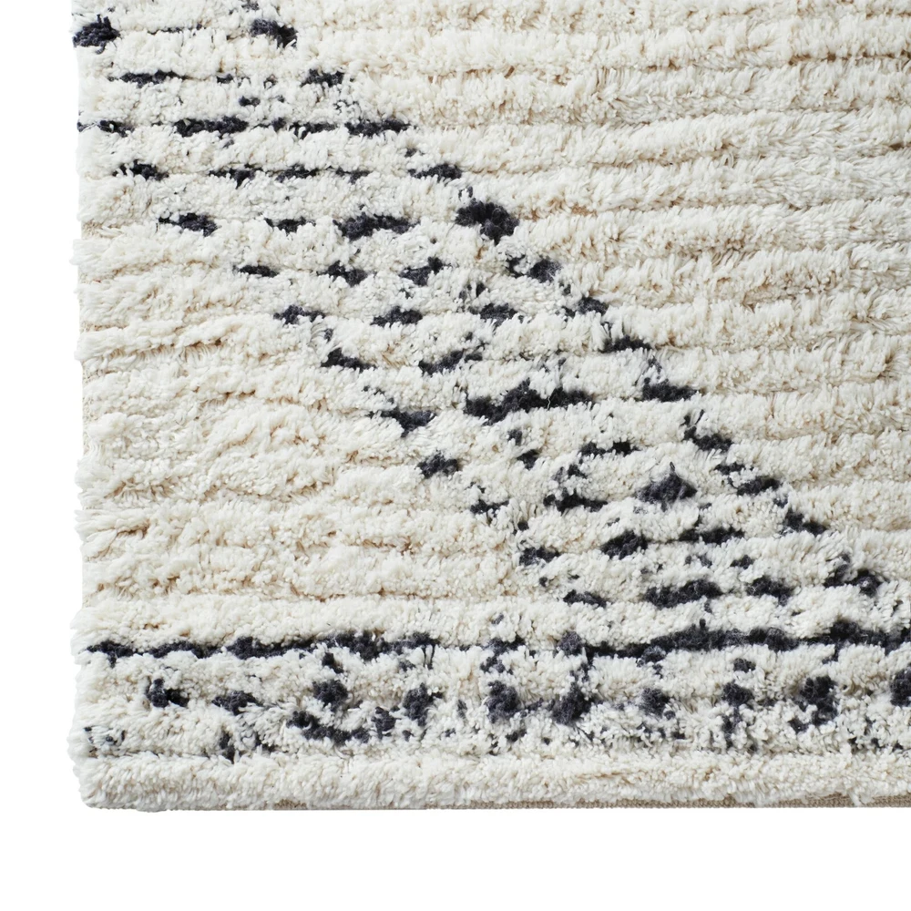 Rectangular ivory and beige indoor rug Offers a subtle yet stylish geometric print with a textured design Available in this 5' x 7' size or in your choice of a 21" x 84", 8' x 10', or 30" x 46" size Made from tufted cotton Caring for your rug is simple with quick spot cleaning Shedding of loose fibers is normal. We recommend vacuuming the rug regularly on a low-power setting with a beater brush