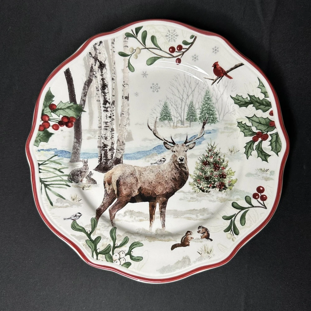 Better Homes & Gardens Winter Forest Buck Salad Plate. Approximately 8 7/8” wide. A CHIP is noticeable on the frontside red trim (no additional signs of use are noticeable). Please see photos for details.