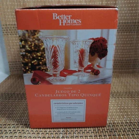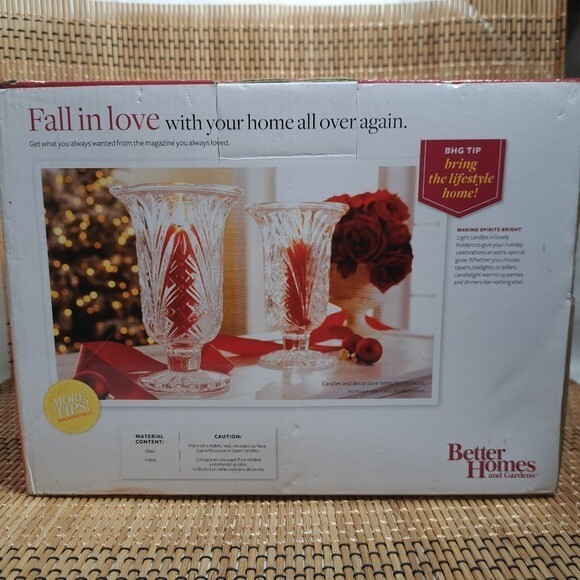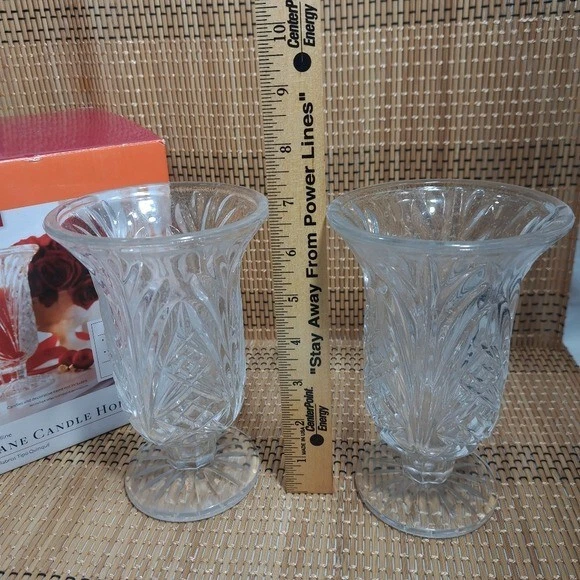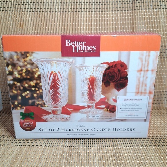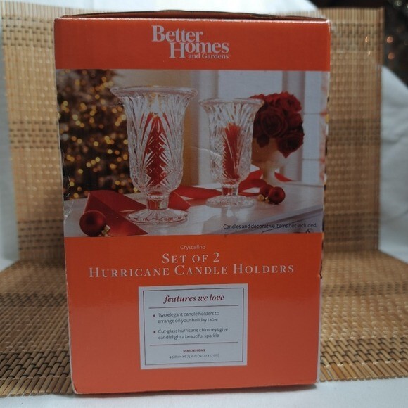 Better Homes and Gardens Crystalline Set of 2 Hurricane Cadle Holders *Brand - Better Homes and Gardens *Set of 2 Hurricane Cadle Holders *Color - Clear (Crystalline) *Condition - Excellent (New) *Please see all the photos in Zoom to appreciate the details. (Please check for all the sizes on some of the pictures from above) *I described this product the best way possible. *If you have any questions, please let me know.