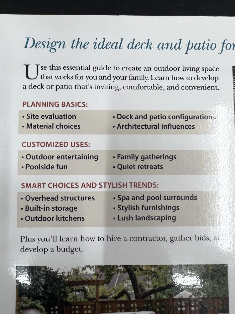 This activity book titled "Deck and Patio" from the "Better Homes and Gardens" design guide series is a perfect addition to your collection. It is filled with 216 pages of large print and illustrated content that caters to young adults and adults interested in outdoor and recreational areas. The first edition of this book was published in 2008 by Houghton Mifflin Harcourt Publishing Company in English, measuring 9 inches in length, 10 inches in height, and 0.5 inches in width, weighing 27 oz. The book features a variety of topics, such as house and home, and it is a trade paperback format. It is suitable for anyone interested in DIY projects like creating their own deck and patio, no matter their ex libris or narrative type. This book is a United States publication and is a valuable resource for anyone looking to enhance their outdoor living experience.