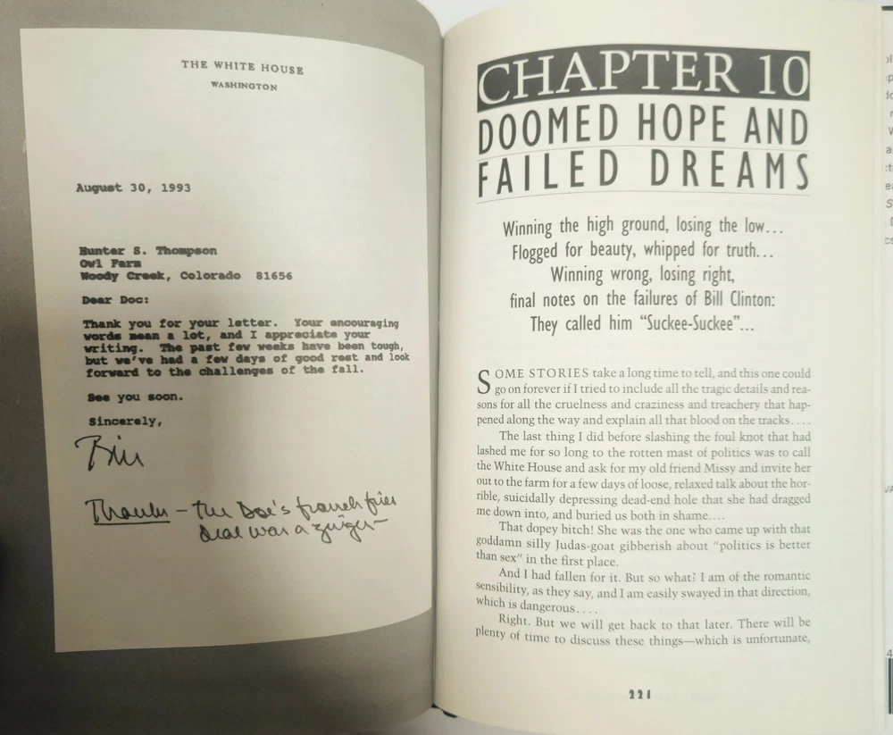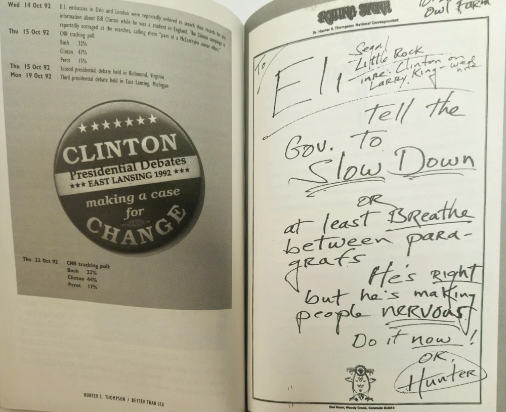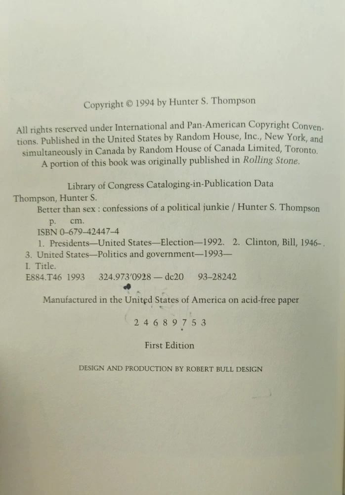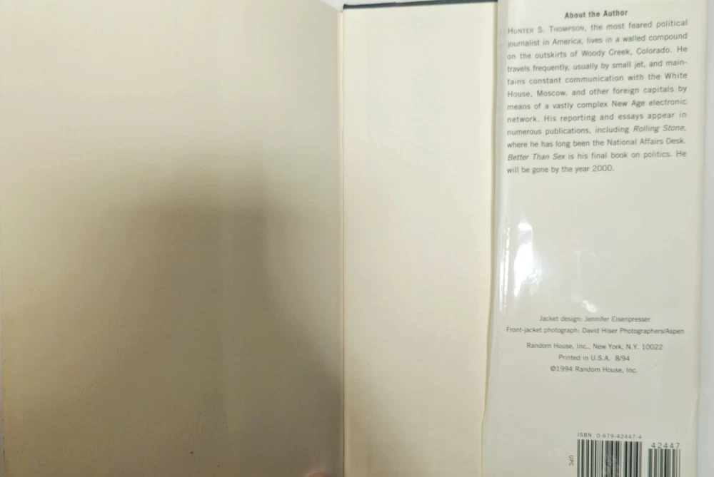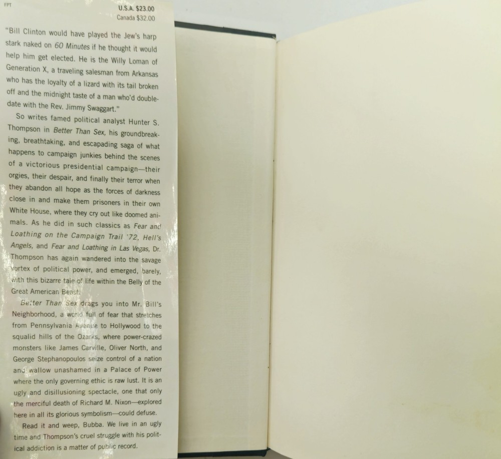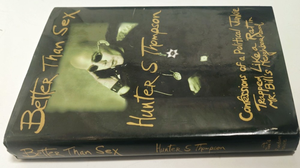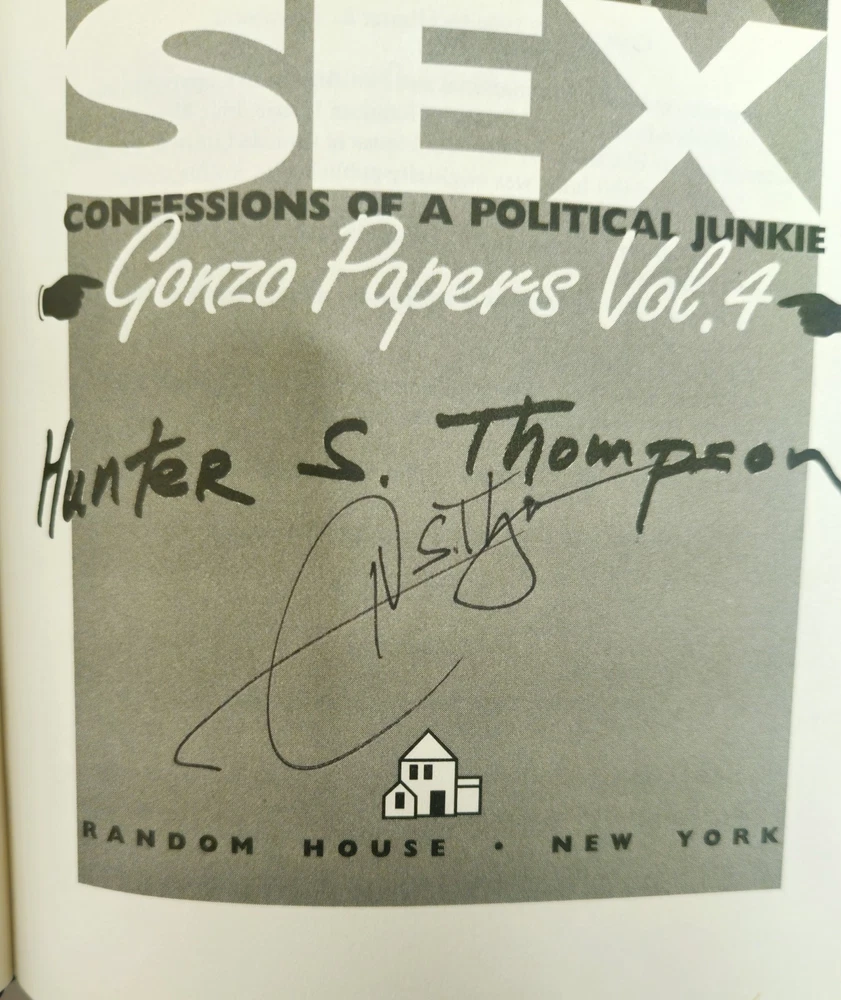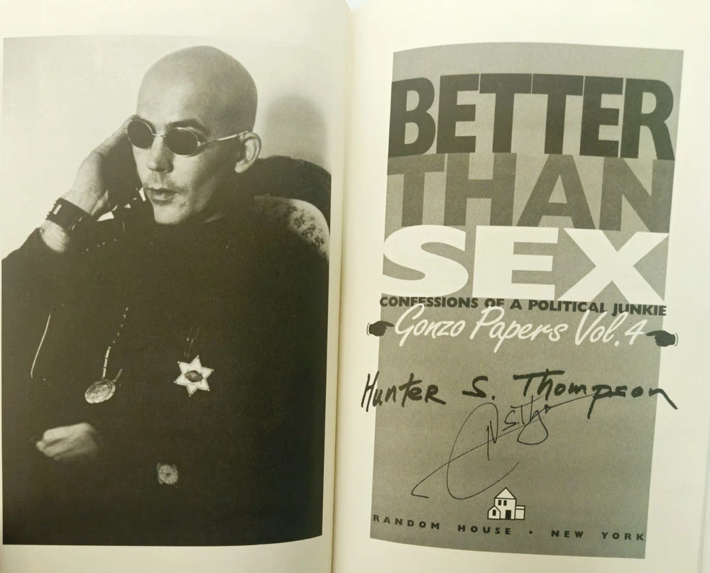 The product is a signed hardcover first edition second printing of "Better Than Sex GonZo Papers Vol. 4" by Hunter S. Thompson, published by Random House in 1994. This collector's item includes the original dust jacket and is a valuable addition to any book collection, particularly for fans of Thompson's work on law, government, and politics. Signed by the author, this unique piece offers a glimpse into the mind of the legendary journalist and is a sought-after item for collectors of rare and limited edition books. This was Hunter's last installment of the four volume "Gonzo Papers" series, and was his last larger literary project in his lifetime, as he did mostly magazine pieces after this publication. He is widely considered one of the pioneers of "New Journalism," along with other notables like Truman Capote and Tom Wolfe. Although he seemed very unhinged later in life, he had a brilliant mind and an unmistakable talent for writing, which led to fame and a small fortune. Unfortunately, his lifelong abuse of drugs and alcohol and largely untreated psychological issues led to Thompson taking his own life in 2005. This is a rare opportunity to obtain a signed piece of political Americana from a pop culture legend.