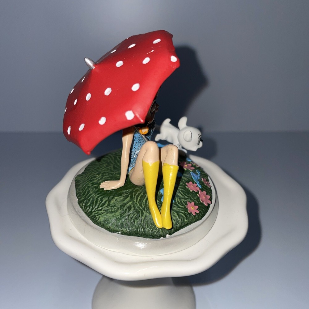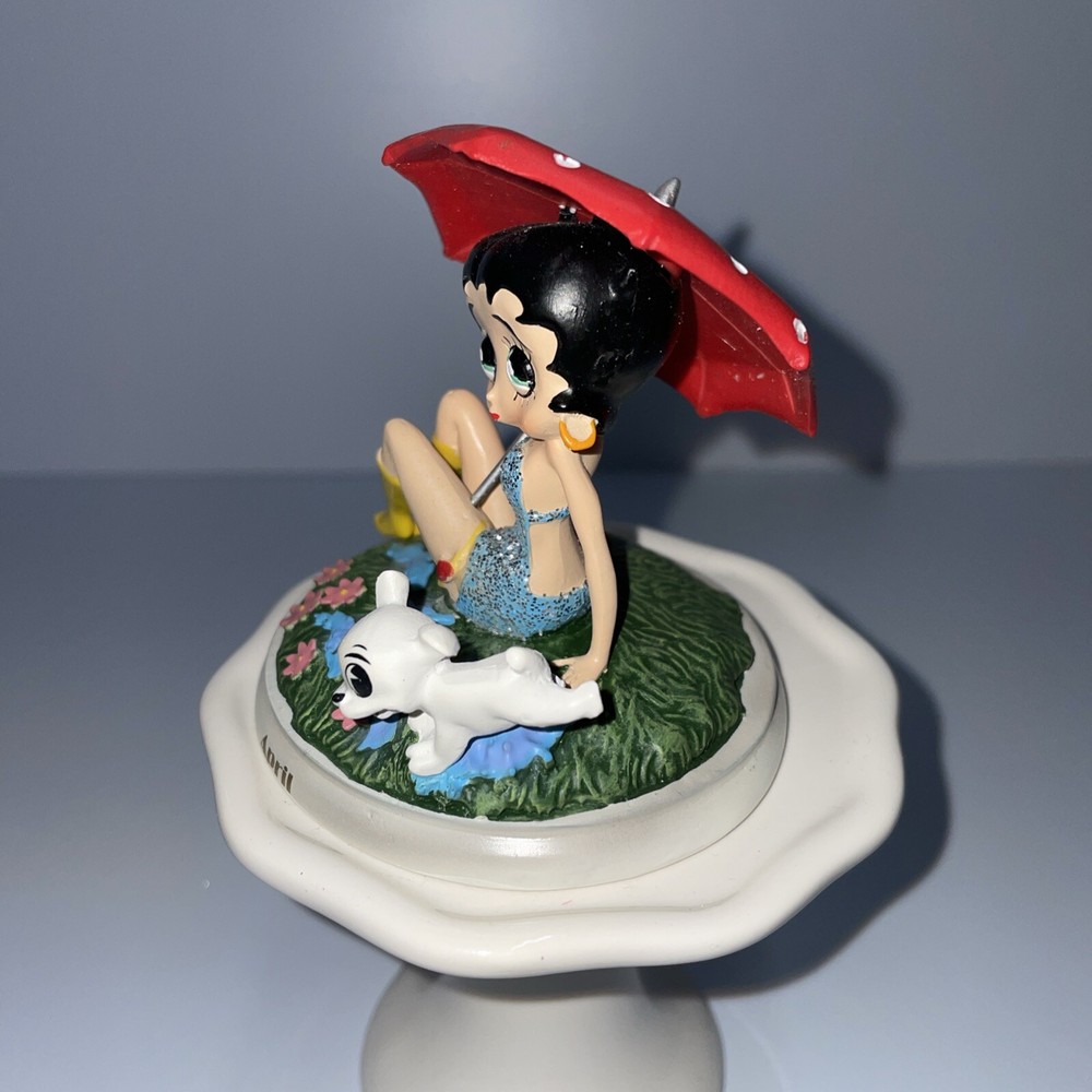 The "Betty Boop April Collectibles Umbrella Figurine" is an original resin figurine manufactured in the 1990s in the United States. This collectible item features the character Betty Boop and is part of the Betty Boop franchise. It was produced by the Danbury Mint and depicts Betty Boop holding an umbrella.