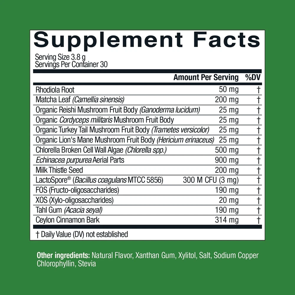 OUR GREENS ARE FAR OUT. Conscious meets comprehensive in this superfood blend that transcends the rest. Our mystic mix of echinacea, rrhodiola crenulata, milk thistle, probiotics, and 4 varieties of powerful mushrooms (including Lion’s Mane and Reishi) helps support a healthy immune system, harmonious gut health, normal whole-body detoxification, and clean energy.* From mushrooms to the microbiome, abundant plants and beyond, the difference is undeniable. This gluten-free and soy-free, vegan blend is complemented by a light matcha flavor, making it easy to enjoy, anytime - anywhere. Beyond Your Average “Green” Drink: Beyond Greens by supports a healthy immune system, harmonious gut health, normal whole-body cleansing, and clean energy.*This soothing formula provides plentiful digestive health benefits, so you can experience less of those common digestive complaints, such as everyday gas and bloating.* Keep typical digestive discomfort in check with this consciously-made formula that promotes microbiome health, resulting in a balanced body and mind.* Cleansing Green Chlorella: A nutrient dense algae with naturally-occuring amounts of vitamins, fiber, and antioxidants.* Broad-Spectrum Mushroom Blend: Featuring lion’s mane, reishi and turkey tail mushroom for immune support with no mushroom aftertaste.* Powerful Probiotic and Prebiotics: Promotes energy levels and immune system health.* Echinacea, Rhodiola & Milk Thistle: The potential cleansing effects of this trio help reduce occasional fatigue and everyday stress while improving concentration.* Energizing Matcha Flavor: Beyond Greens goes down easy in smoothies, drinks, and recipes.