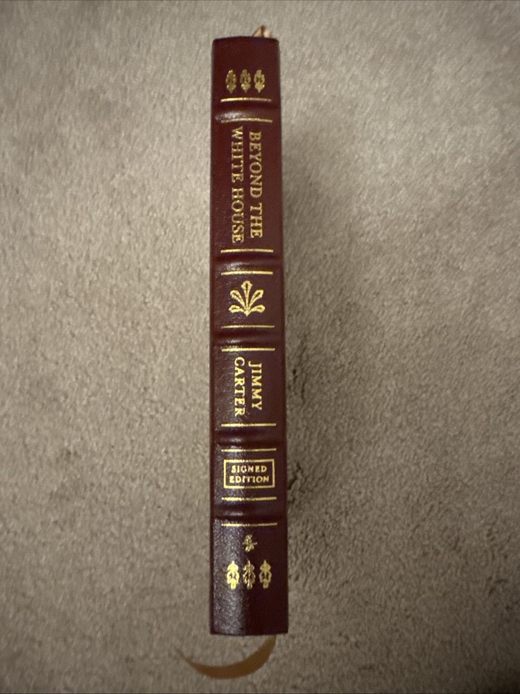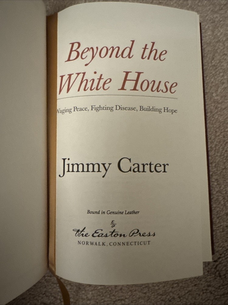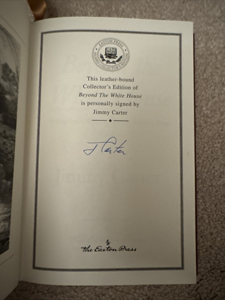 Clearing out for big move, collectable and never opened. The product is a collector's edition leather-bound book titled "Beyond The White House" by Jimmy Carter, published by Easton Press. This historical book is written in English and is a valuable addition to any collection of books and magazines. It offers a unique perspective on history and is a special edition that would appeal to any book collector or enthusiast of historical literature.